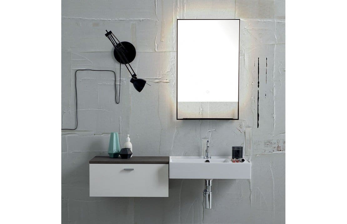 Square n.2 consists of a washbasin in ceramics Square 101 x 46 cm right in glossy white, a piece of furniture Wall-Hung Two Drawer Finish Lava 120 x 40x h 27 cm, one mirror container finish Lava 57.5 x 15 x h 63 cm, one LED lamp, an open wall unit finish Lava 40 x 22x h 80 cm, one 2-door reversible wall-hung column with Lava finish 40 x 24 x h 160 cm and finally a chrome drain and siphon.