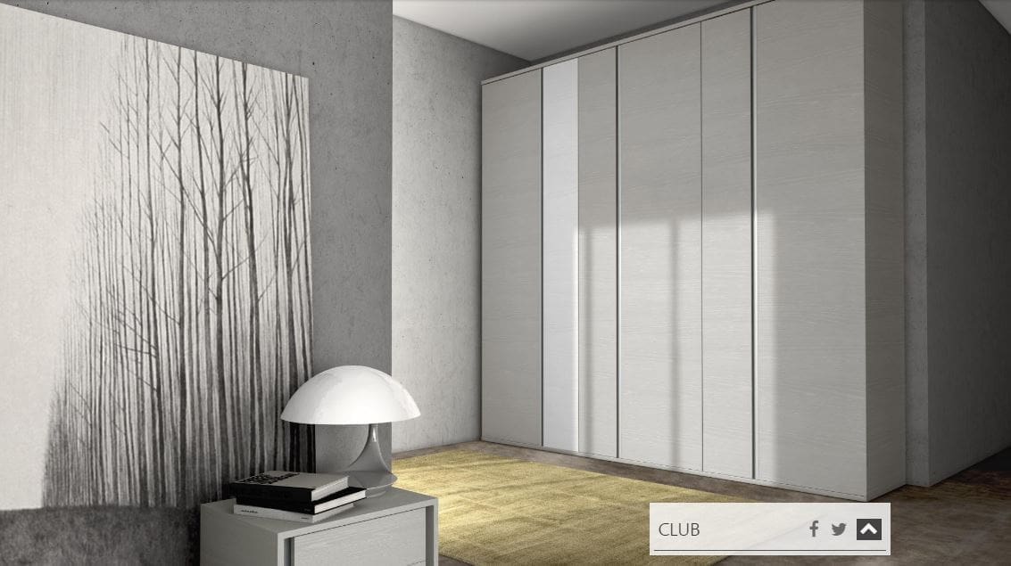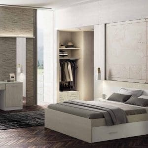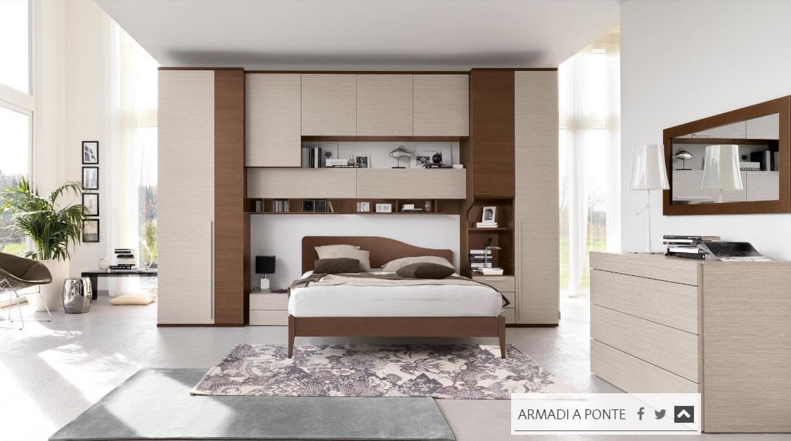 Bridge solution created with wall units with differentiated depths. Sinuous and even rounded lines for the Musa bed. The solution includes: wardrobe; suspended modular; made-to-measure top length 240 cm; Wall unit; Parallel cupola; wardrobe W/shaped side without plinths; pair of clogs 90 cm long; Look bedside table, finally Musa bed with Nettuno bed frame.