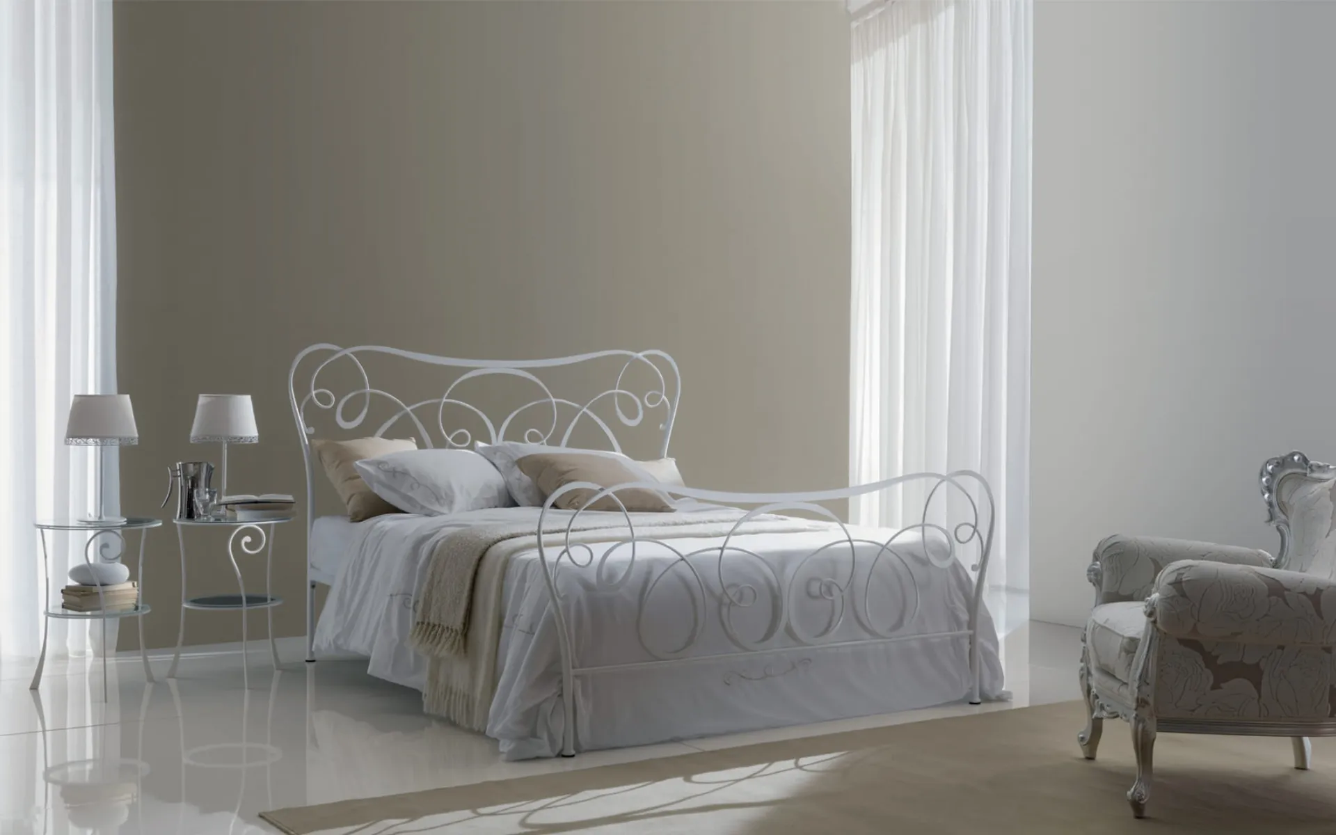 Altea is an iron bed decorated with hand-polished silver leaf. The bed has a classic and elegant design that easily matches different types of furniture, but is particularly at ease in a classic-style bedroom.