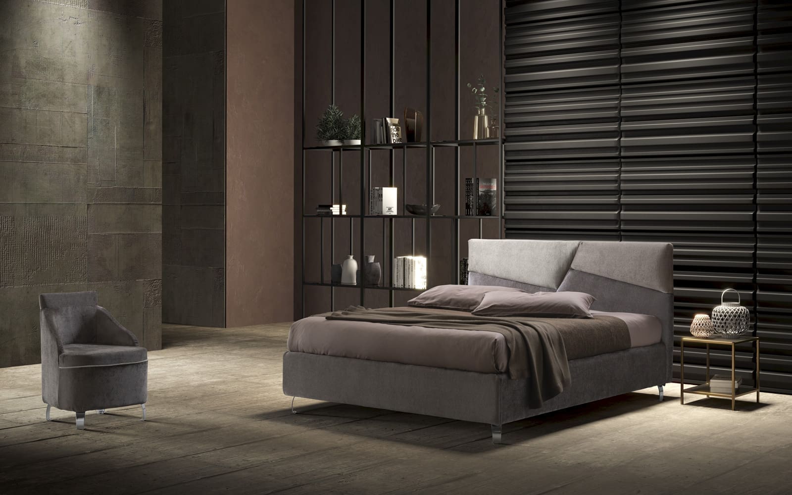 It is a bed whose headboard is characterized by three soft, multicolored padded panels of geometric shape which highlight its aesthetics; the panels can be made in various colors using the different coverings present in the samples. Each numbered element (see images) can be customized with the range of colors present in the fabric samples.