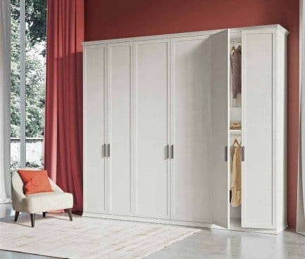It is a large wardrobe with hinged doors in wood with Bucaneve finish and handles. Other finishes are available on request. The wardrobe has 6 doors. Each component with two doors measures 90 cm.
