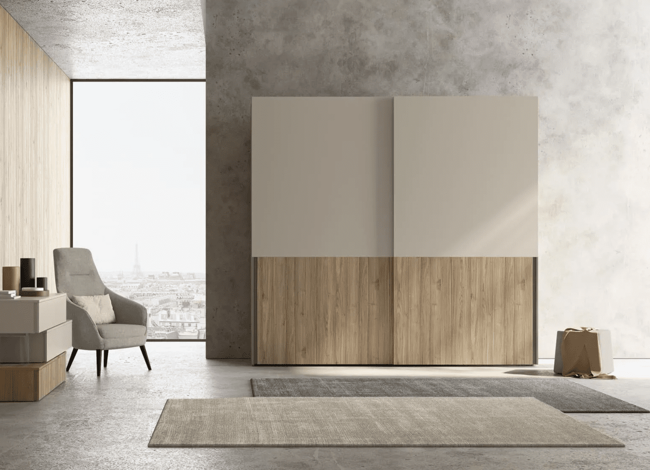 Cutting is a melamine wardrobe with 2 sliding doors, each 135 cm long. Thanks to its large capacity, Cutting will allow you to store what you want inside without having space problems. It has a clean and linear design, with a geometric detail that gives it a strong personality.
