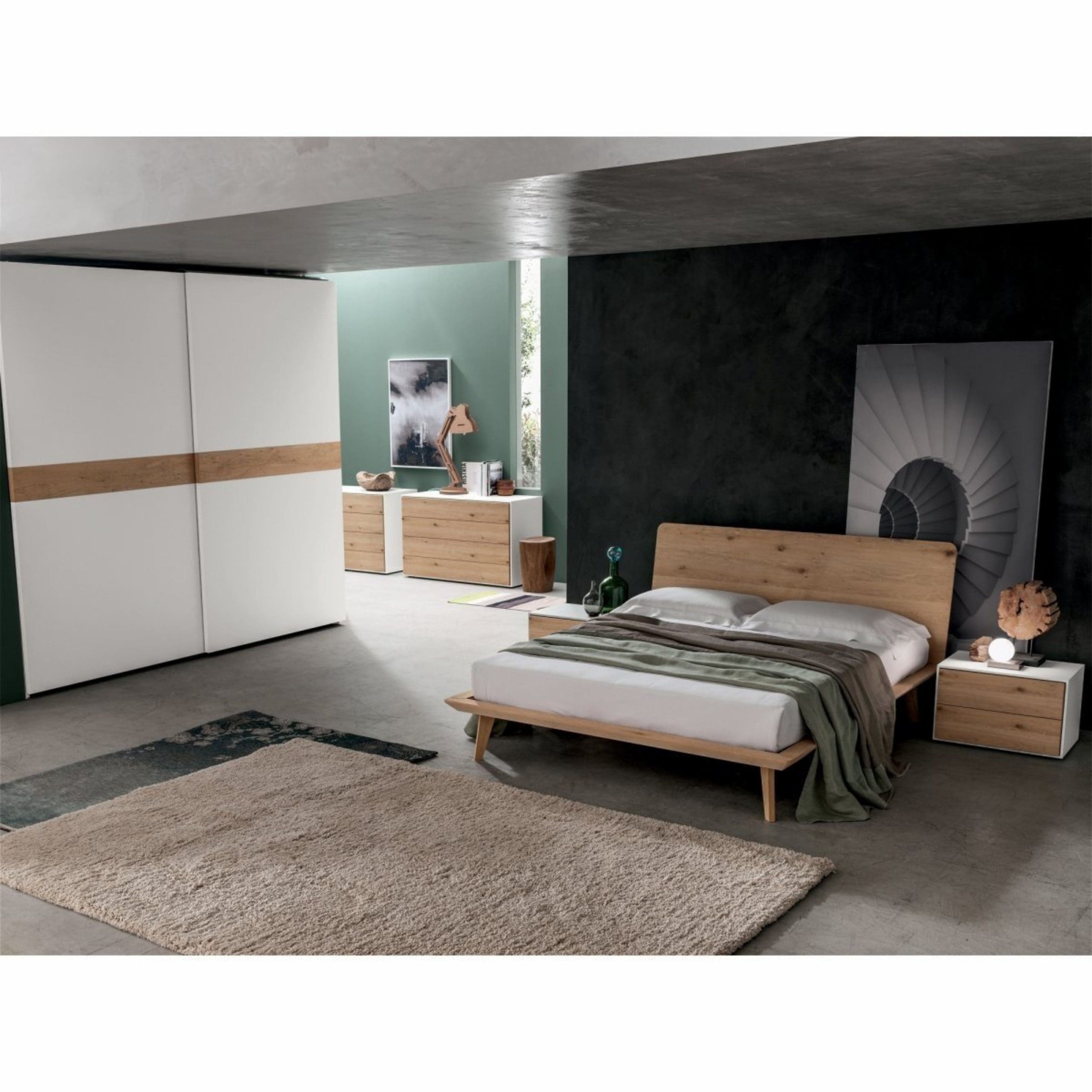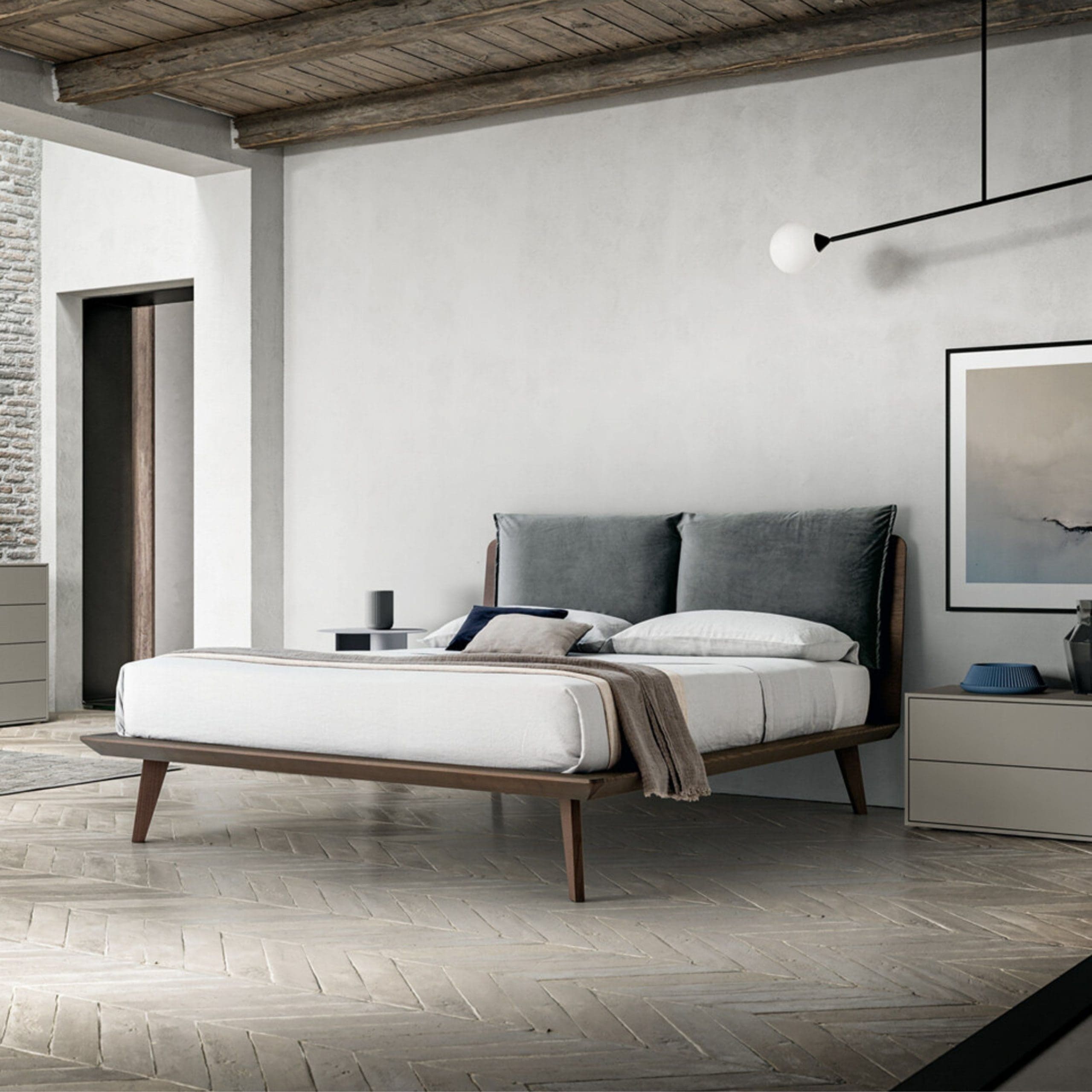 The Santa Lucia Talak model bed is available in veneer in 4 different colors with wooden feet. The 160 x 195 cm slatted base is included in the price. The bedside table mod. Diciotto system shown in the photo is not included in the price, but is available on request. The bedside table can be combined with the bed, with a lacquered body and veneered fronts matching the shade chosen for the bed.