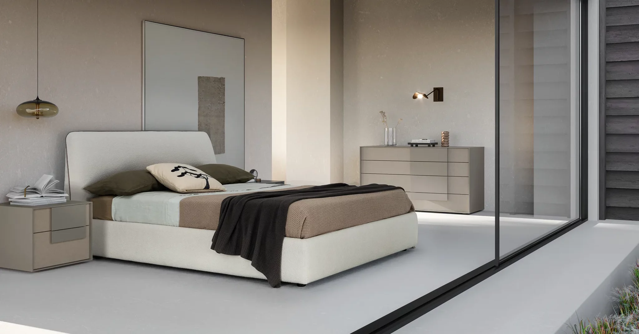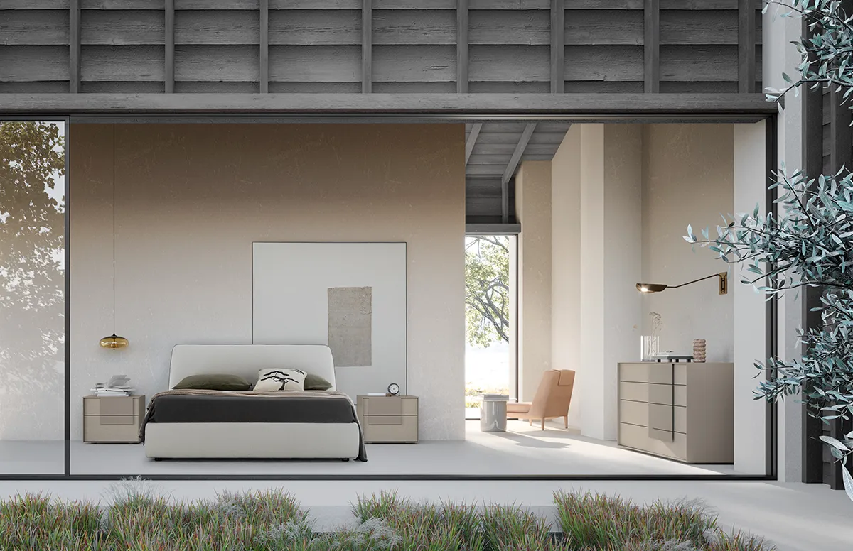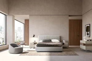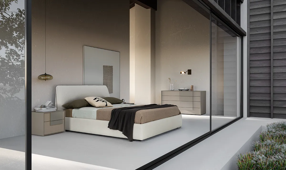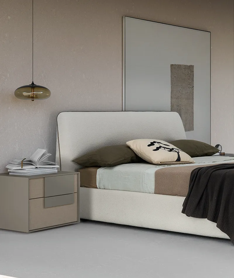Characterized by soft lines, it has a trapezoidal profile that gives a refined atmosphere to the entire sleeping area, which can be enhanced in continuity or in contrast with the shapes and colors of the Cube bedside tables and dressers. It has a padded headboard and bed frame, covered with category A fabric. The base and mattress are not included, but the bed is designed for a support base measuring 160 x 200 cm.