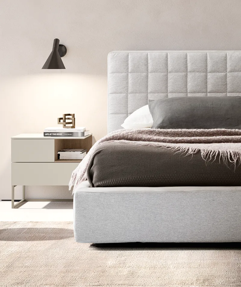 The Code group with day compartment is composed of a chest of drawers and a pair of bedside tables, characterized by a geometric design. The elements have a structure and top made of melamine, available in the F1 melamine and LA lacquered finishes, and a painted metal base available in the Cast Iron and Platinum colours. The drawers are equipped with slowed down square guides.