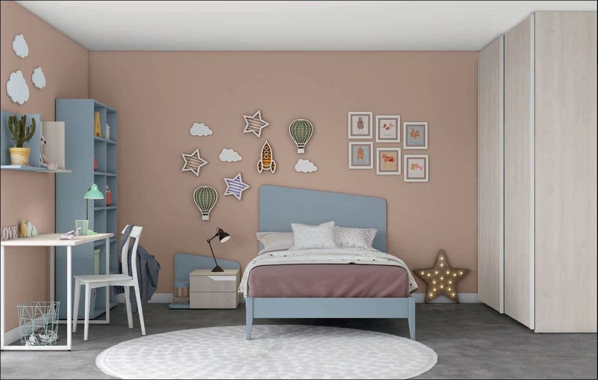 Moderna cameretta ben accessoriata di tutto il necessario per consentire ai vostri figli di avere la cameretta dei sogni. La cameretta si compone di una zona studio realizzata con una scrivania, sedia in legno e due simpatici cubolotti dalla particolare forma proposti in due dimensioni differenti, due librerie, mobile ideale per riporre libri e non solo. Nella zona notte troviamo un comodino dalla forma insolita, con mensola laterale, capiente e colorato, un letto da un posto e mezzo con giroletto nettuno e, un moderno armadio con 2 ante scorrevoli. Cosa aspetti, contattaci realizzeremo la cameretta perfetta per ogni gusto ed esigenza.