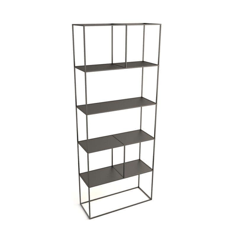 10 mm thick metal bookcase with recessed shelves mounted with no visible fixing system. Anthracite epoxy painting (manganese).