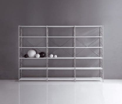 Socrate is a bookcase with cross uprights in painted steel rod and technopolymer feet. The shelves are made of micro-perforated steel, 100 cm long, and extremely resistant