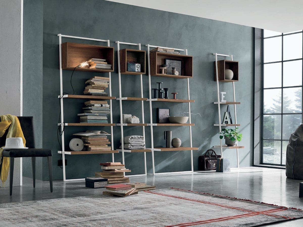 The Movida bookcase has a modern metal structure with anthracite finishes, while the shelves are in dark knotted material. The Movida bookcase is made up of a Pedro container available only in textured material and 3 shelves in dark knotted textured material. The oblique lines give a sense of dynamism to the structure. Movida modules give a creative thrill to the library.