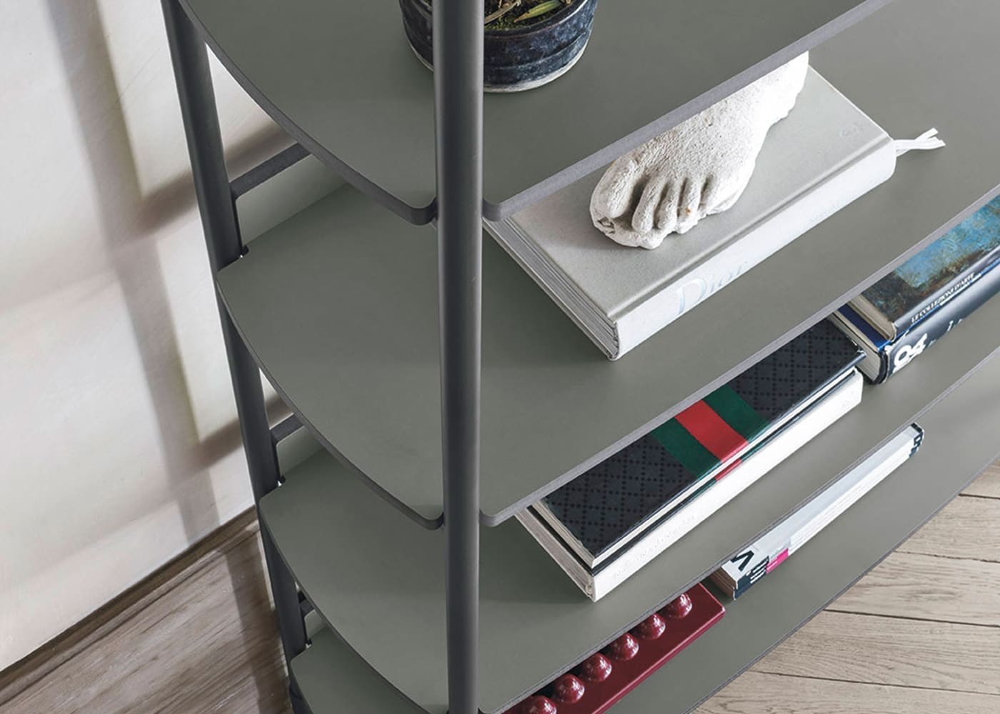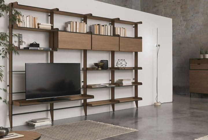 Raise Ink Modern Bookcases by Tomasella A piece of furniture that remains timeless, even with the passage of time: books and objects find space on shelves that are perfectly integrated with the Structure. Small backs add style and a sense of order. The offer refers to a single bookcase L 104 cm H 165 cm , model Ink , shelves in basalt CDF , structure in anthracite metal 160. This item is also available with anthracite frame and walnut shelves.