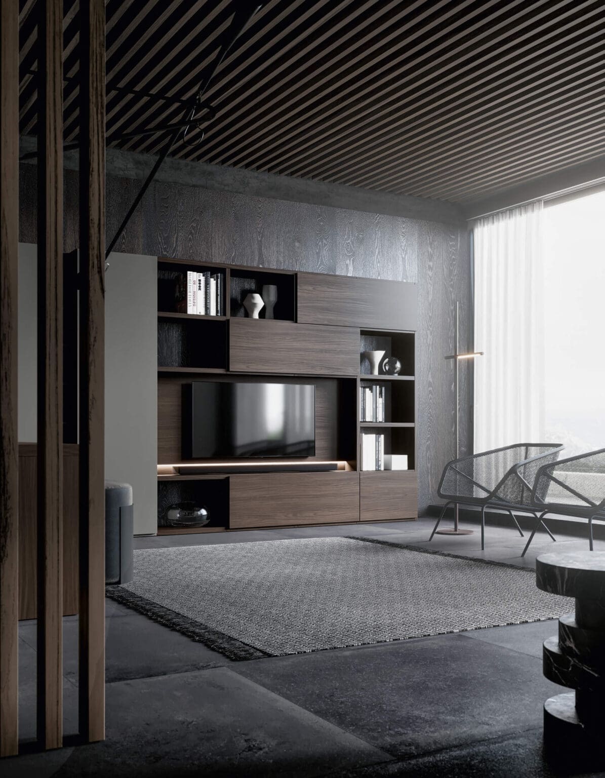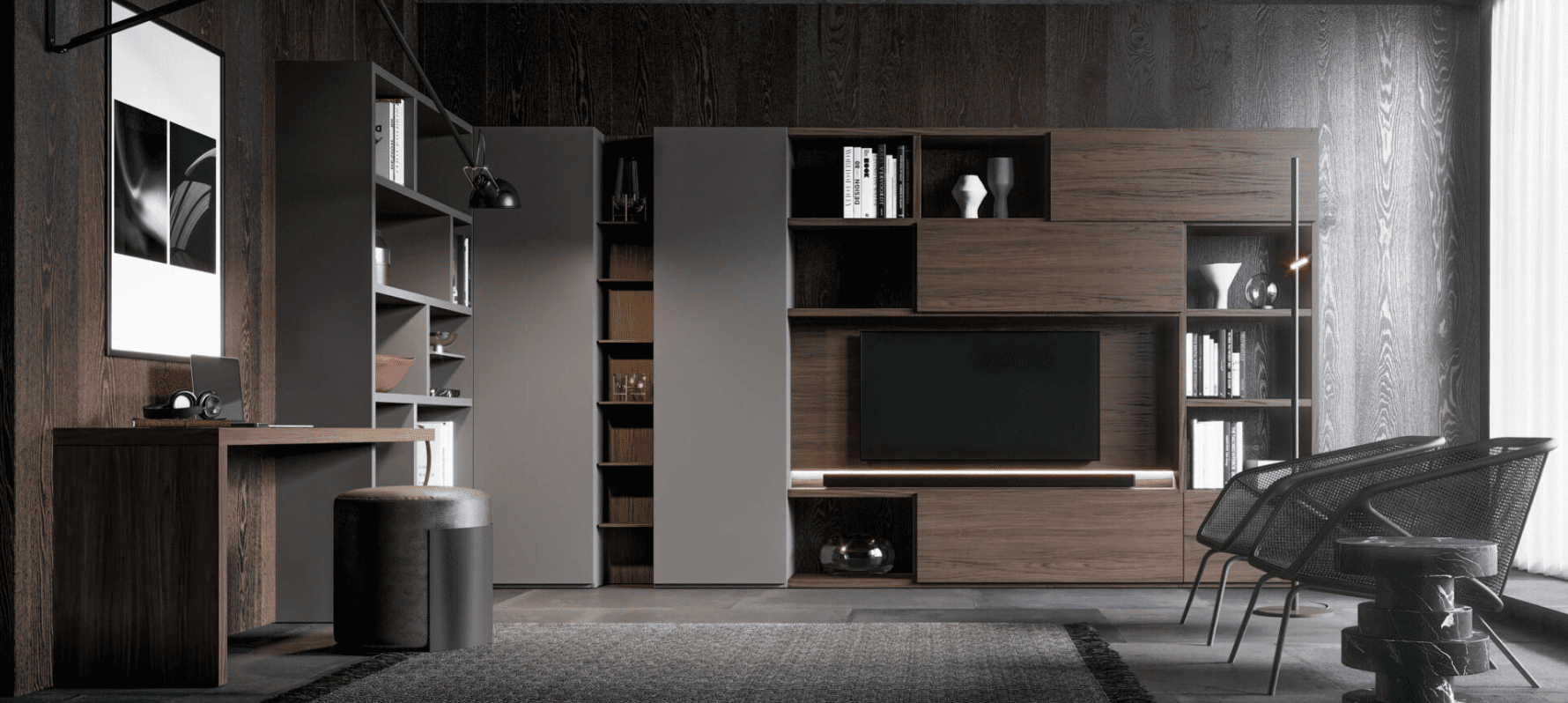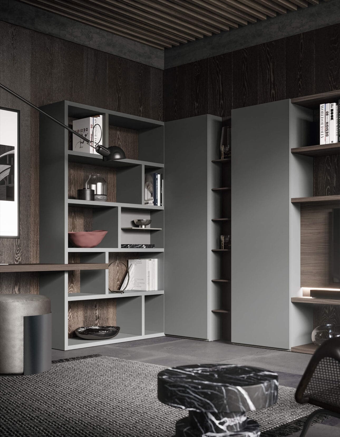 The corner bookcase alternates open compartments, closed modules and columns and is integrated into a desk. The vertical or horizontal doors, which can be customized in different finishes, give dynamism to the configuration of the bookcase and allow you to visually close some spaces to optimize storage. The desk module can be placed on the suspended storage modules or integrated into the structure of the shoulder through a cut in the external side. A solution that allows, in a small space, to place the desk next to the bookcase in a practical way.