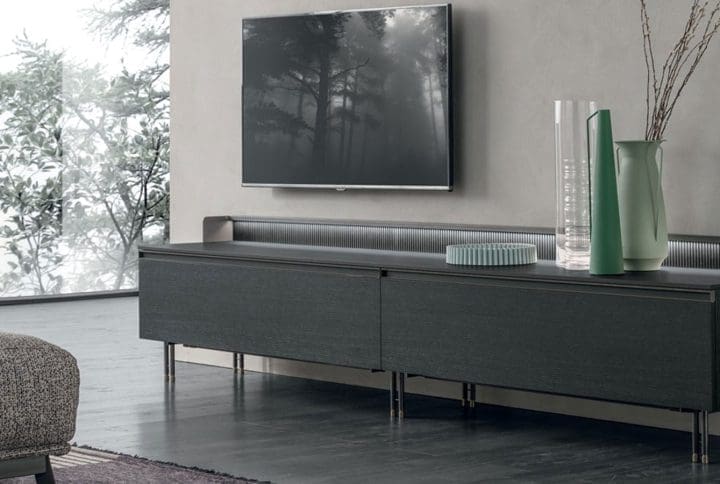 Metropolis sideboard by Tomasella The Metropolis sideboard represents a modern take on the sideboards of yesteryear, which were usually placed in the dining area or living room. This cabinet, with a refined and sober style, features hinged doors made of glass, high metal feet . Metropolis is available in different colors, heights and widths to best meet aesthetic and space requirements. This complement is characterized above all by its practicality and versatility. In fact, it can be used not only to hold and put in plain sight the most beautiful objects and knick-knacks, but also to order sets of dishes and glasses. In addition to inside the living room, it can be placed in the kitchen, at the entrance and in any other corner of the house. Alone or combined, vertically developed or low, in any context in which it can be placed the sideboard stands out for its personality and added value. The glass door matches perfectly with all the other finishes. The offer refers to the model Metropolis D01 basalt lacquered structure and top 176, drawers in charcoal oak material. Tracks base metal anthracite/brass.