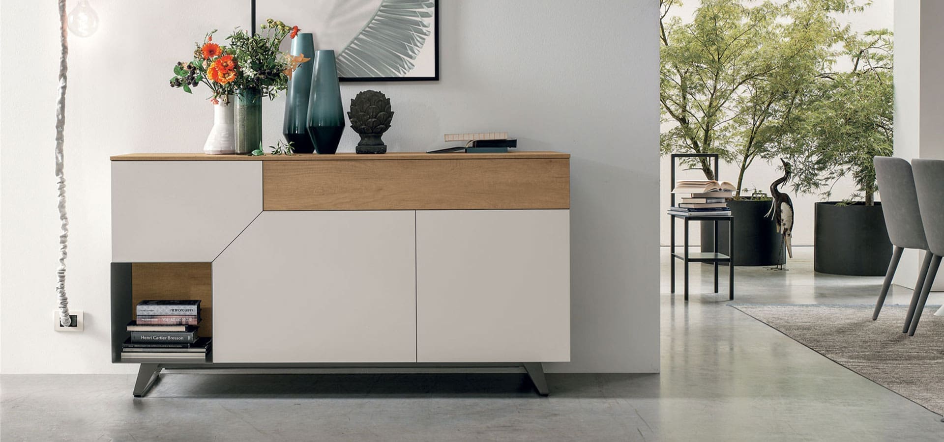 Sideboard model Remix by Tomasella The cut corner is the hallmark of the sideboard: the asymmetrical door and the combination of different materials give originality and personality to both the furniture and the environment. The offer refers to the model Madia Remix X02 structure matt mother-of-pearl materico, materico nodato chiaro and metal anthracite 160.