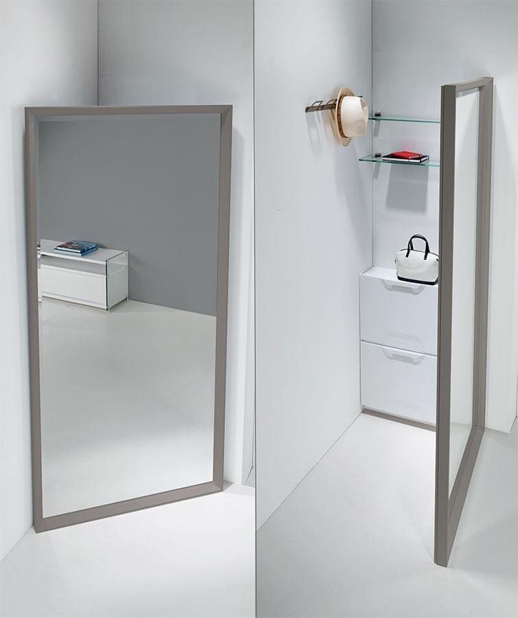 Riflesso is the perfect mirror to furnish your home with elegance, creating a new space: a wardrobe corner where you can comfortably store shoes, clothes and much more. The system allows applications from a minimum depth of 70 cm. The mirror support structure is reversible and can be used for opening to the right or left.
