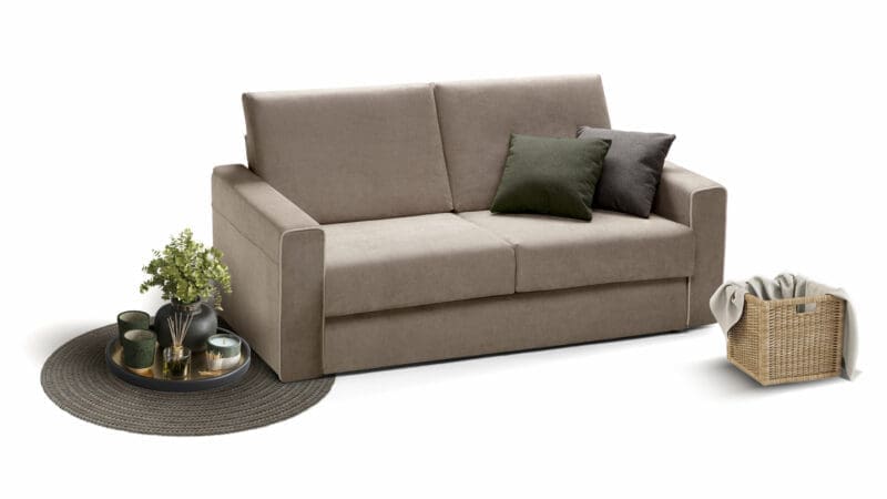 Brian is a maxi 3-seater sofa with a welcoming and particularly comfortable seat which, if necessary, transforms into a bed with a 160 x 190 cm mattress. The 20 cm high mattress is made of polyurethane foam, as is the padding of the seat and backrests. This feature guarantees long-lasting comfort and quality . Brian is composed of an electro-welded mesh with straps on the seat surface. The armrest is 20 cm regular with contrasting edges and can also be requested in the slim version without an increase.