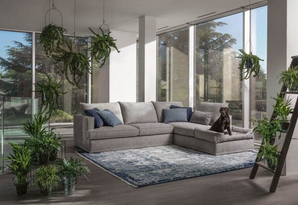 Soft seats and enveloping backrests in mixed feathers make Glammy a sublime sofa with elegant charm. Glammy also offers in its vast modularity elements dedicated to the comfort of animals, such as the stain-resistant pouf and its removable cover to be added on request.