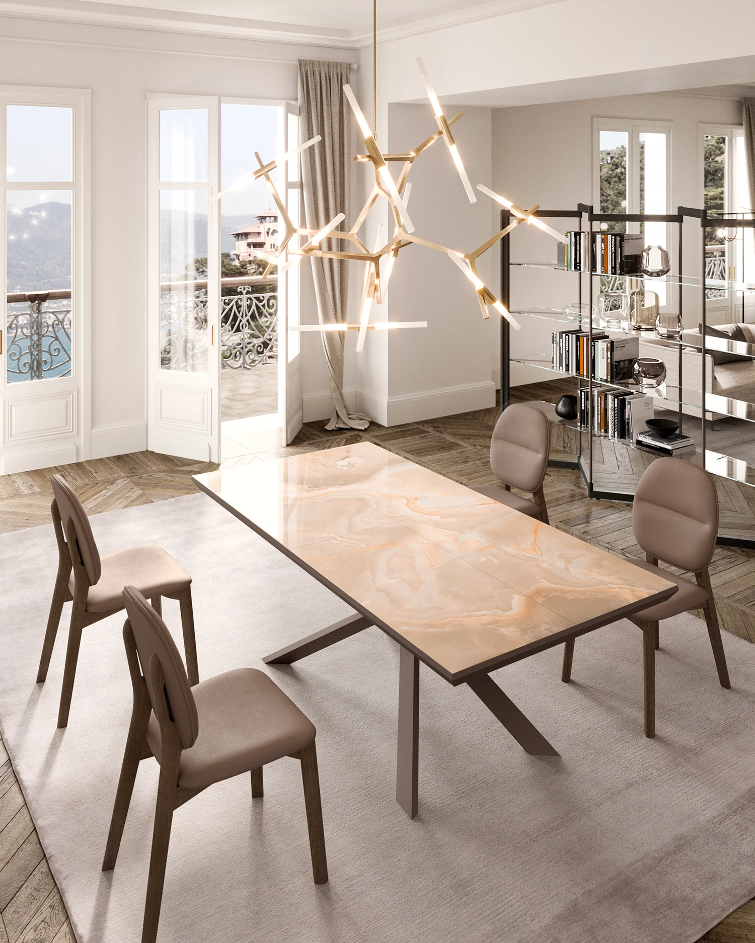 Il basamento incrociato è in metallo laccato bronzo MT97 , con piedini regolabili in altezza, piani e allunghe in Marble Glass finitura onice lucido . Nella finitura di piano Marble Glass piani e allunghe mantengono continuità nel disegno sia chiuso che aperto.