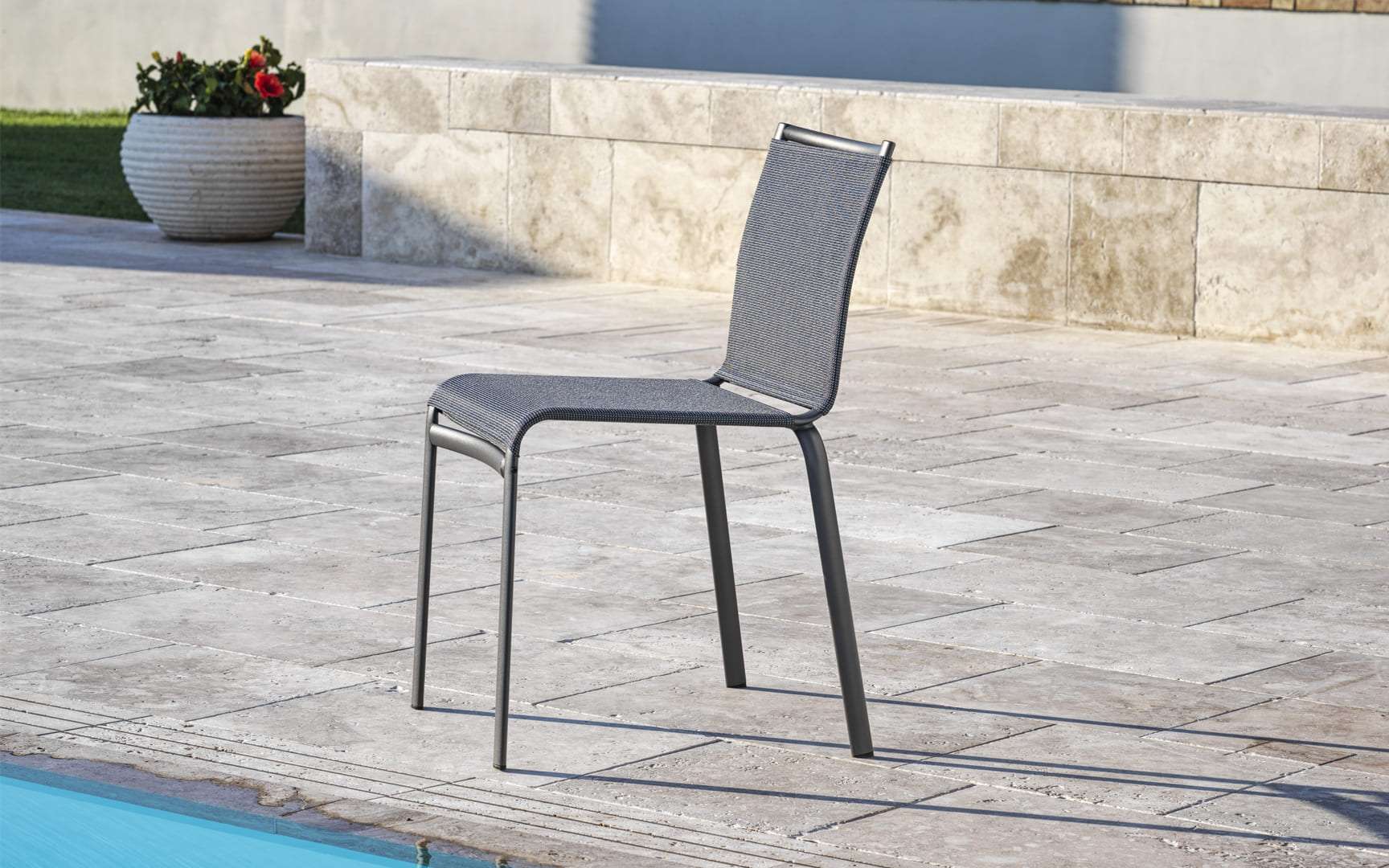 The colors available for the seat and backrest are grey, white, sand or black. The characteristics of the structure made of oval tubing are unique and make this product unmistakable and absolutely innovative. Seat and backrest are also available in soft texplast. Net is also available with armrests at an additional cost.