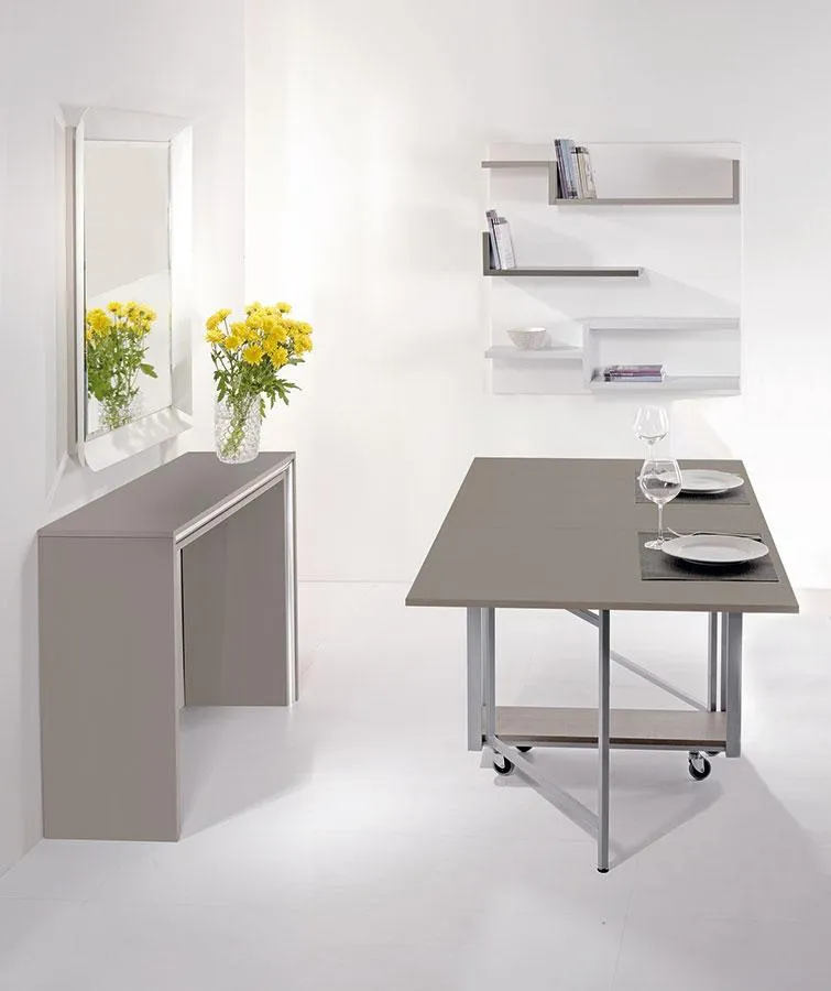 In addition, with its design with simple yet refined lines, your home will acquire a completely new, modern and elegant look. The retractable table is available in different finishes: structure in sablé white with top in slate grey, matt white or matrix white laminate or structure in dove grey with top in dove grey laminate.