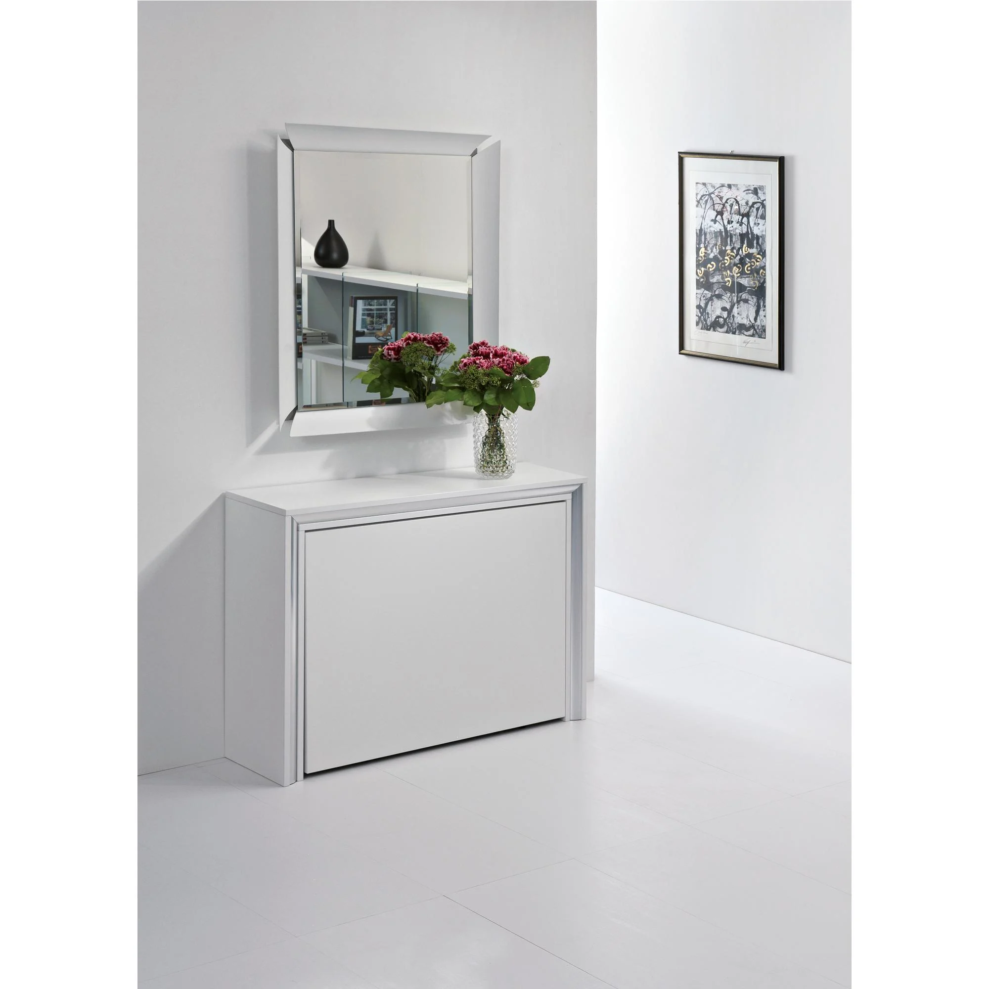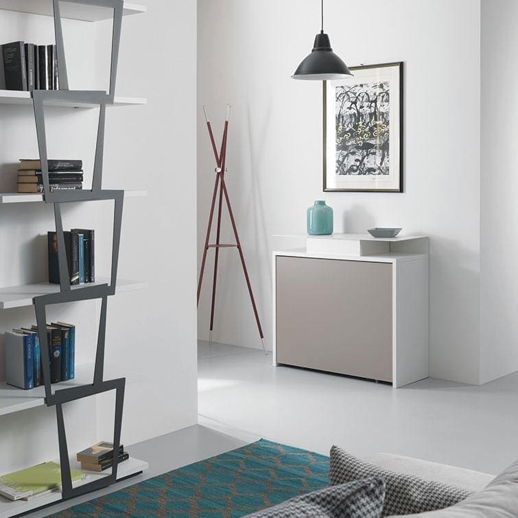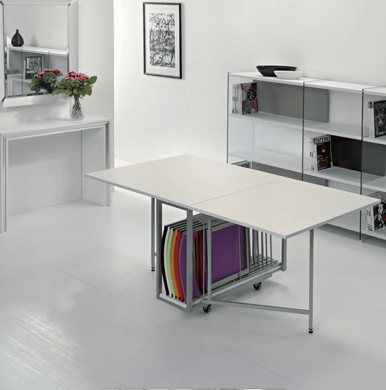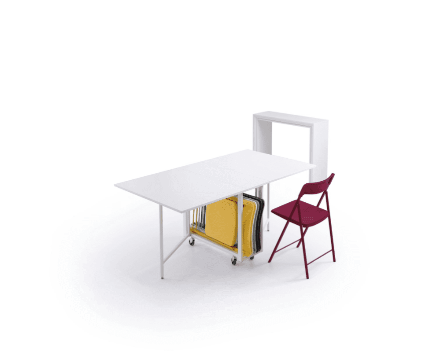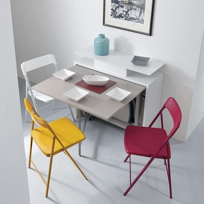 Archimede is composed of three elements: console, built in eco-friendly laminate and finished with a polished or painted chrome-plated aluminium, the table retractable chair rack, also with an ecological laminate top and a solid painted steel structure and finally the 6 Zeta model chairs , elegant and resistant, with their steel structure and plastic backrest and seat. You won’t need large tables occupying the living room to be able to invite friends and family to dinner: just open the console to have all the space you want available.