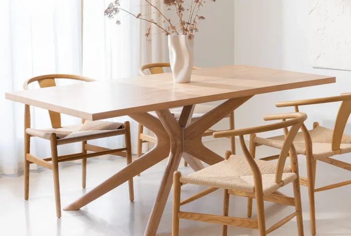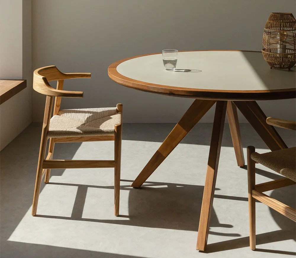 Gamila is a fixed circular dining table with a solid wood base, legs inclined outwards, and a sturdy eco-concrete top. Gamila can accommodate up to 6 people.