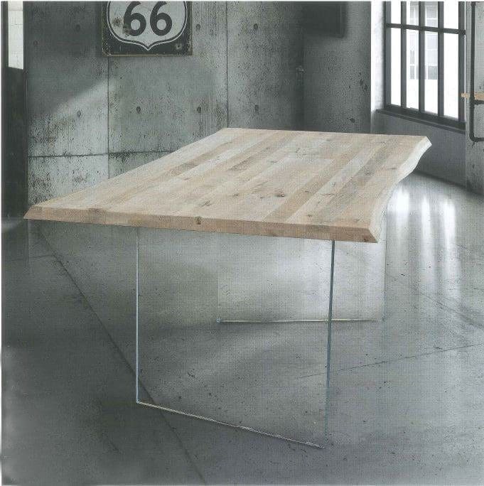 This fixed table has an open-knotted solid wood top and crystal legs. The clear oak top accentuates the material effect of the table, which therefore appears more natural to the touch and to the eye. It has one side with rounded lines, while the other is squared, creating a broken effect.