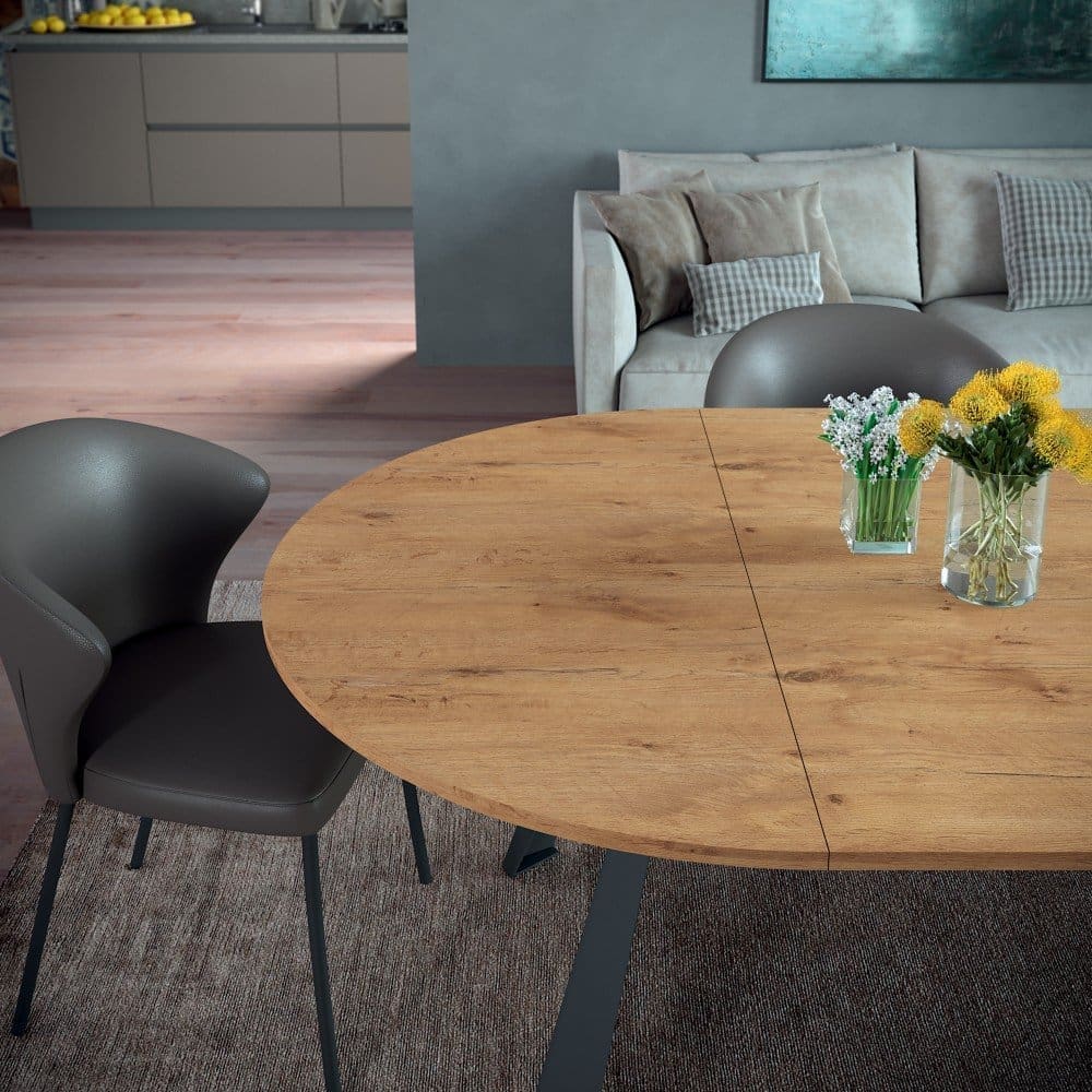 Convivio is an extendable circular dining table with a metal base, legs that stretch outwards, and a sturdy eco-wood top. Convivio is characterized by three additional 18 mm extensions that allow it to accommodate from 4 to 10 people.