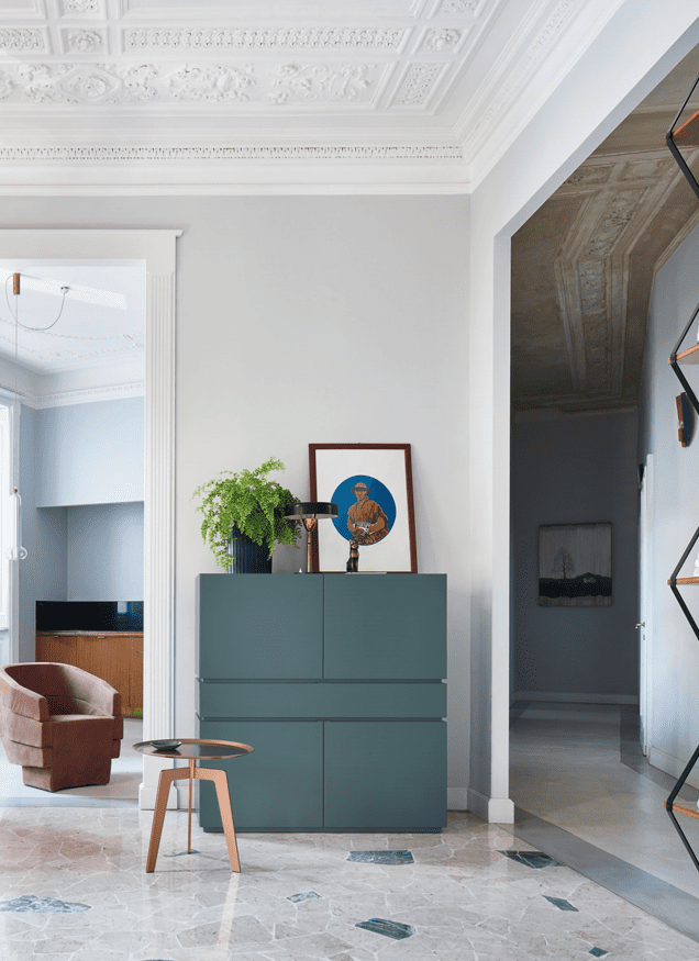 Cidori 9 es un aparador montado en el suelo con 4 cajones, ideal para explotar espacios pequeños. La unión del lateral y frontal está a 45° y la parte superior está ligeramente baja, lo que permite obtener una bandeja. Esto permite que el aparador obtenga juegos sugerentes de superficies y volúmenes.