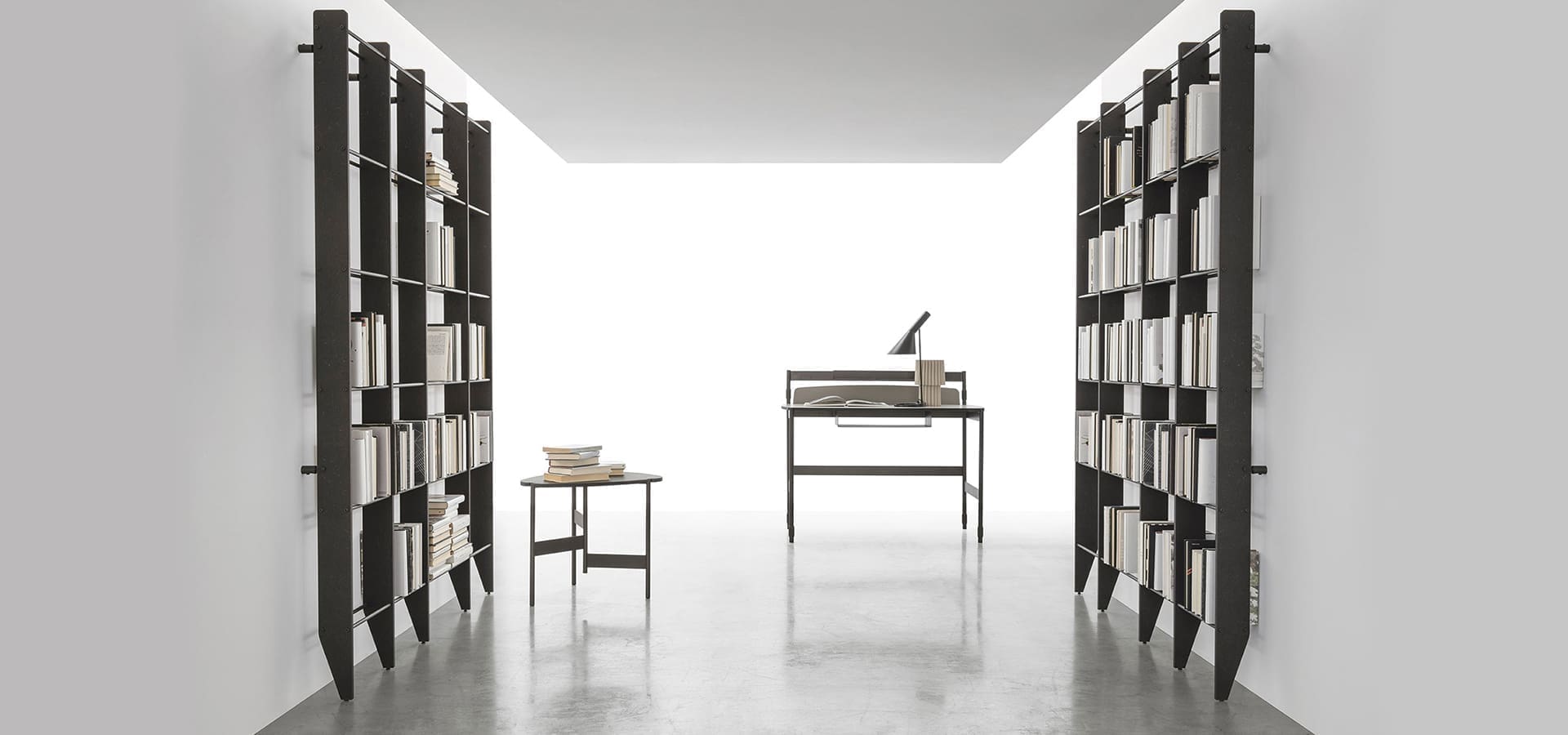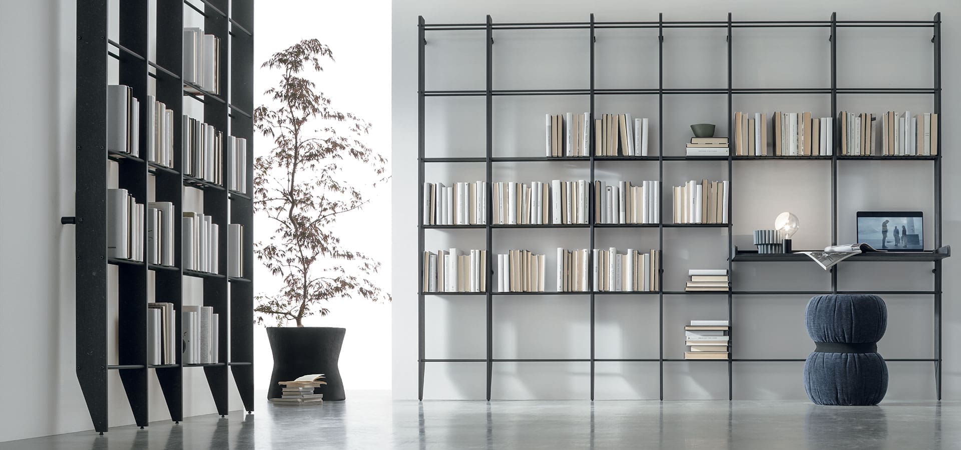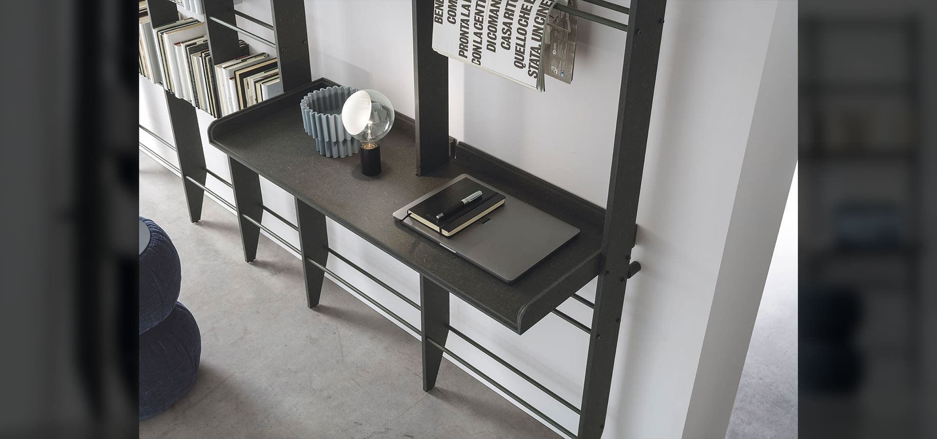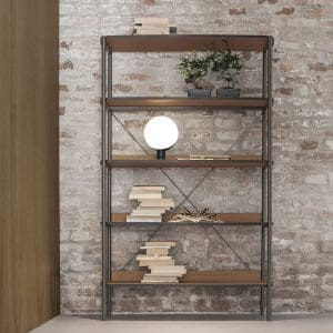 Librerías modernas Elevan el Tiempo Unidad_ti 122 de Tomasella Un accesorio de decoración que permanece intemporal, incluso con el paso del tiempo: libros y objetos encuentran espacio en estanterías que se integran perfectamente con la Estructura. Los pequeños paneles traseros añaden estilo y sensación de protección. Mucho más que una librería: un espacio para trabajar. El tablero de escritorio integrado en la estructura y la adición de un asiento crean un práctico rincón de oficina en casa que no ocupa espacio extra y se integra perfectamente con el resto. La oferta se refiere al modelo Raise Time Unit_ti 122 estructura de CDF veteado negro. Tubos de metal antracita 160.