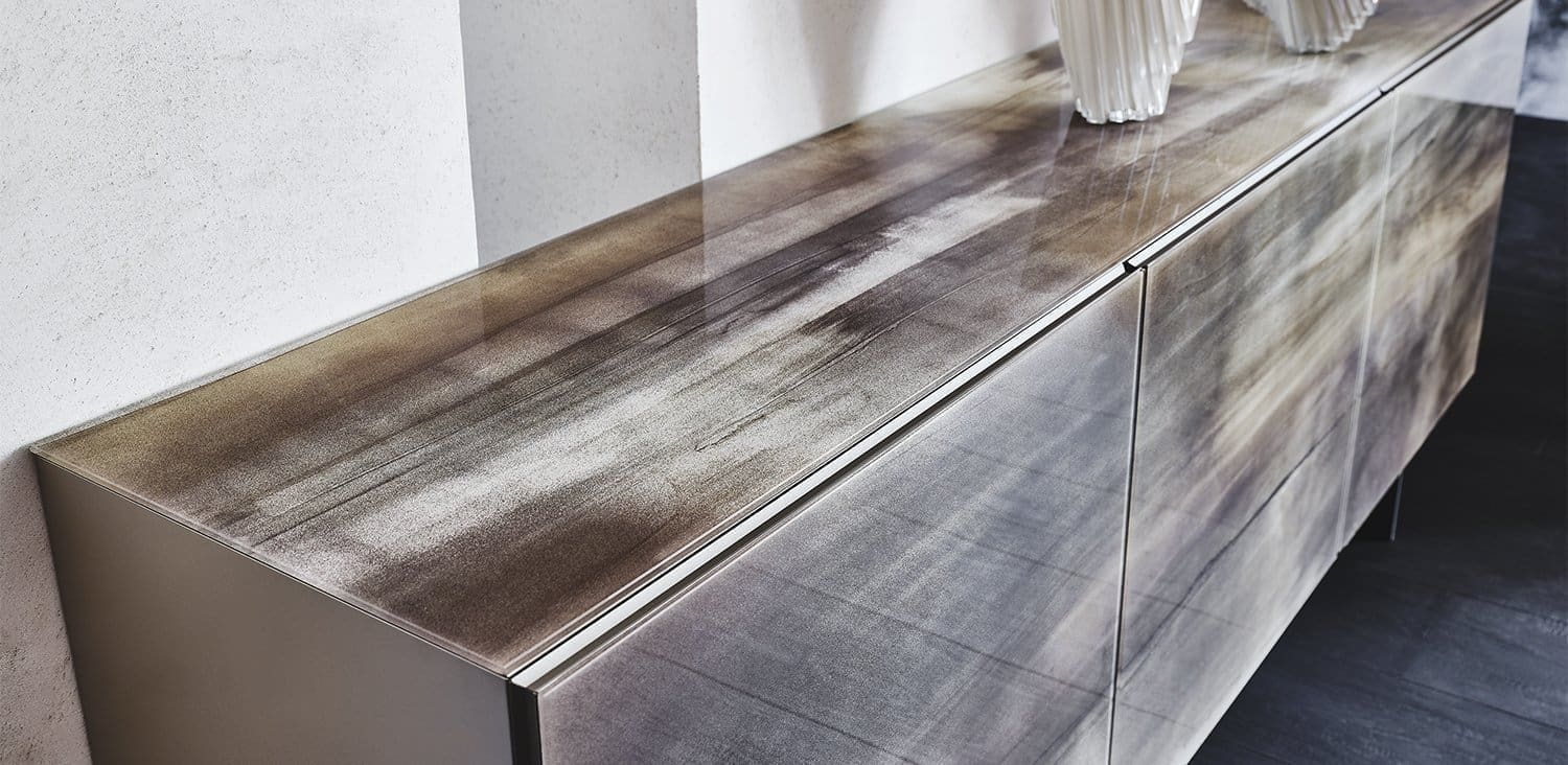 Focus Crystalart es un aparador de almacenaje de dos o tres puertas de madera lacada en blanco mate o grafito mate. Con un recargo, también está disponible en titanio. Las puertas están hechas de vidrio extraclaro con impresión artística decorativa en dos variantes de color. Los perfiles son de aluminio pintado con titanio gofrado.