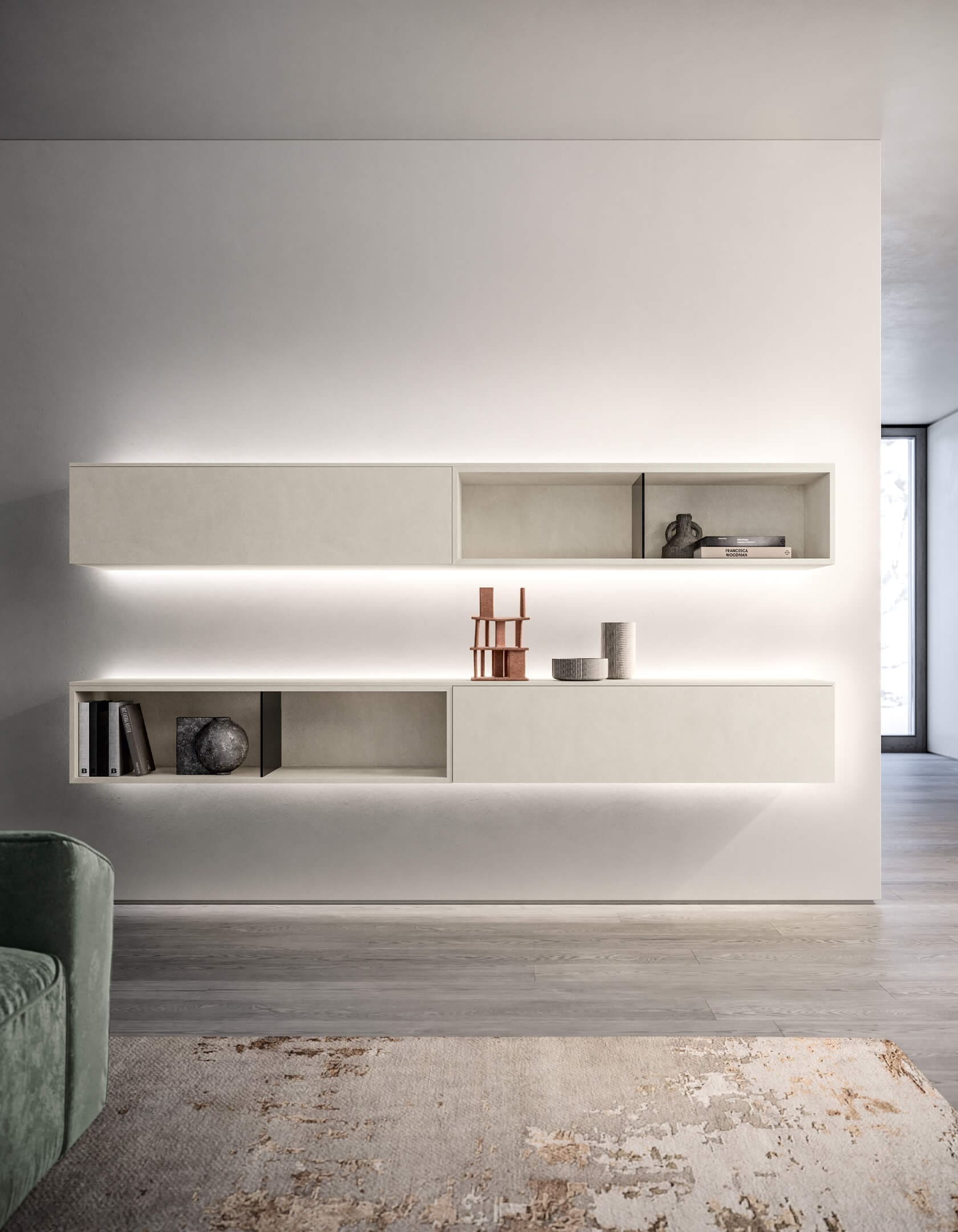 Una composición que se extiende en longitud: los muebles bajos lineales se combinan con muebles altos compuestos por módulos cerrados y compartimentos abiertos y el mueble de TV Cinto. La boiserie y el estante grueso comparten el mismo acabado y juntos delimitan el área dedicada al televisor: una práctica superficie de apoyo y, al mismo tiempo, una solución decorativa. Cada elemento está disponible en una amplia variedad de tamaños, así como acabados; Por lo tanto, con los mismos módulos es posible amueblar incluso espacios pequeños. La relación de aspecto cambia, pero la funcionalidad permanece sin cambios. La sala de estar se completa con muebles altos retroiluminados integrados con módulos maxi-abiertos: las mamparas de vidrio ahumado dividen el espacio y elevan el nivel estético de los elementos.