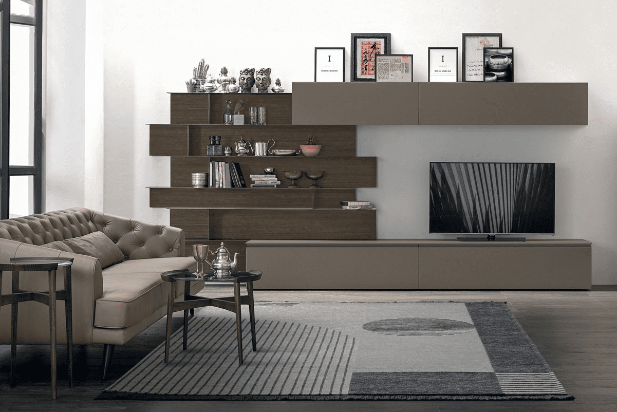 Dado que el salón es una estancia muy habitada, es fácil cansarse de composiciones con tonos fuertes, muy coloridos o ricas en elementos particulares, elegidas porque se inspiran en la moda del momento. La pared equipada de Tomasella no aburre, sino que enriquece su espacio sin cansar.