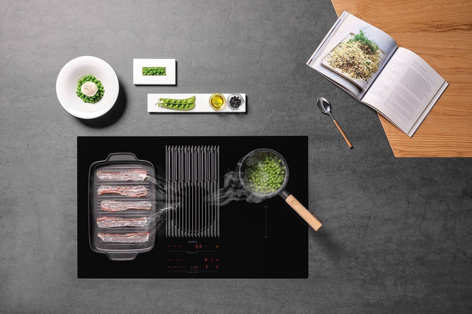 Esta placa de inducción tiene 4 zonas de cocción y una campana integrada, gracias a la cual puede cocinar cualquier plato con una cómoda extracción de humos. La interfaz de Nikolatesla Libra es extremadamente intuitiva y fácil de usar gracias a un único control deslizante directo que controla las funciones de cocción y succión. Seguir los pasos de una receta es aún más fácil e inmediato gracias a su báscula integrada. De hecho, es posible pesar directamente en la olla, a cualquier nivel de temperatura, agregando los ingredientes uno tras otro durante las fases de cocción.