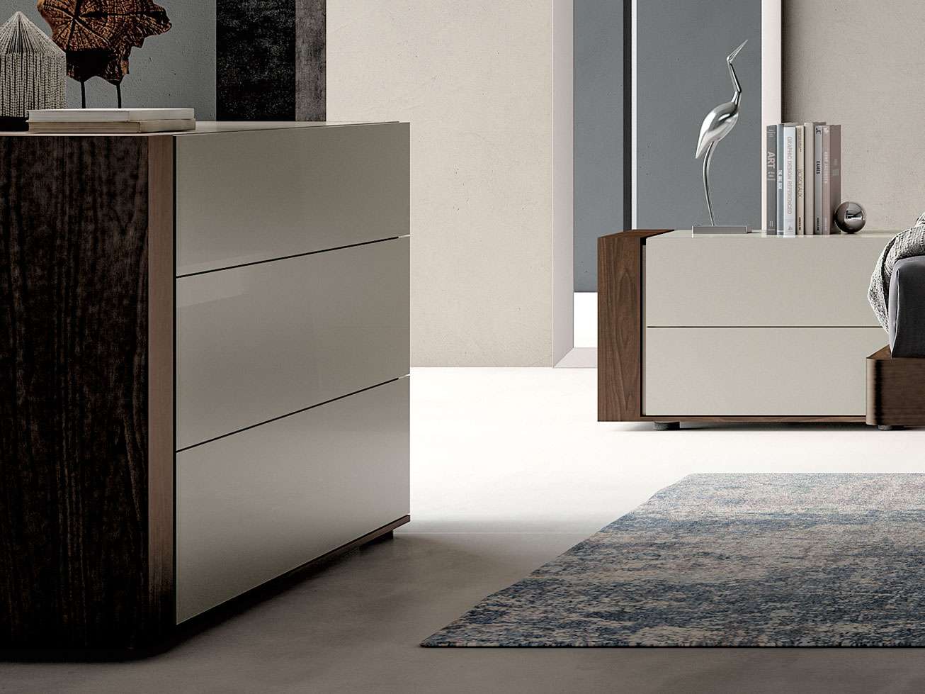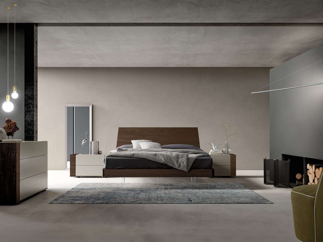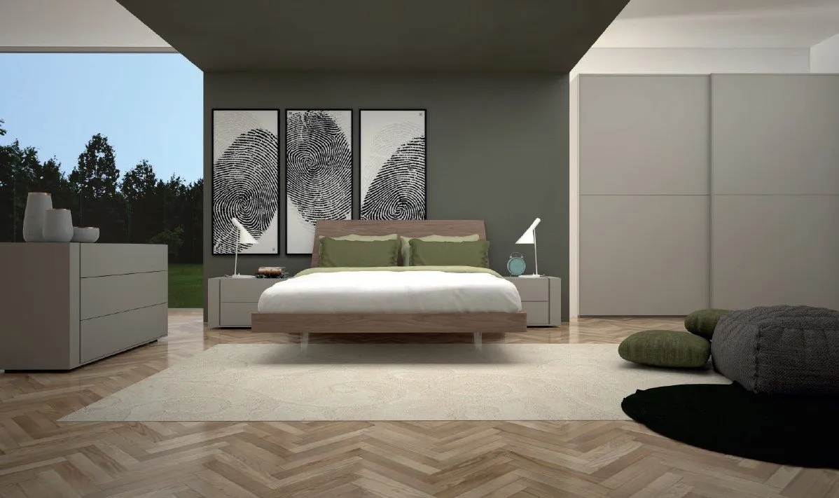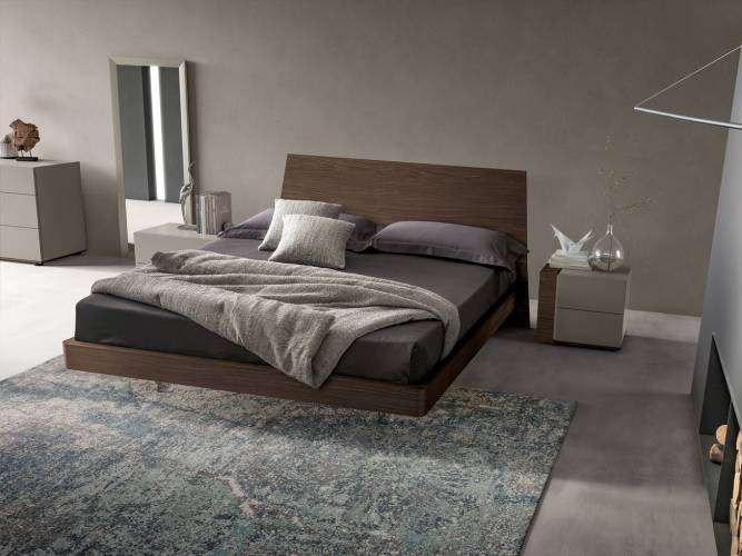 La oferta incluye la cama doble Levante, las mesitas de noche y tocador Dolomite y el armario corredero Snow . La composición es la que se muestra en las fotos.