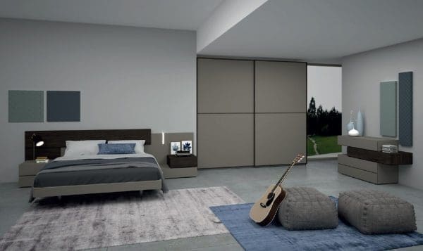 La oferta incluye la cama doble Scacco, las mesitas de noche y la cómoda Innova y el armario corredero Duecù. La composición es la que se muestra en las fotos.