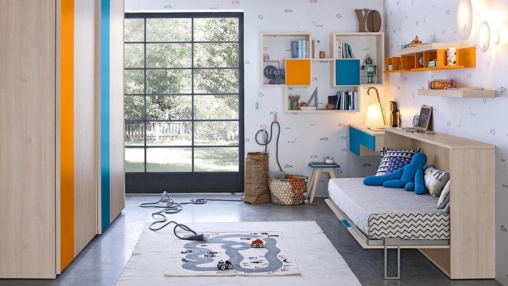 Equipado con un sistema Click con cama individual y somier, es una solución agradable para aquellos que no quieren renunciar a la belleza de los colores y la madera en la habitación de los niños.