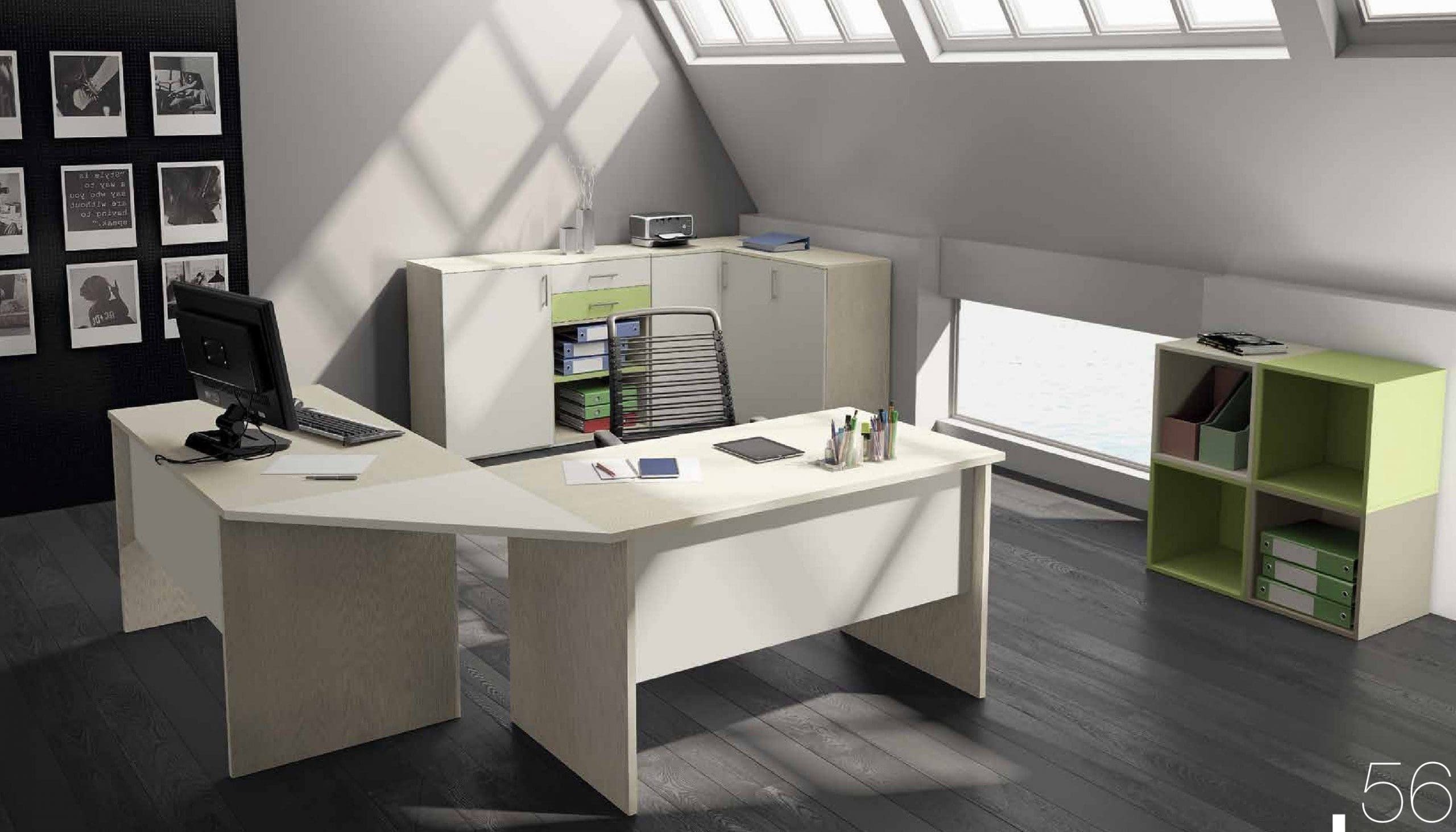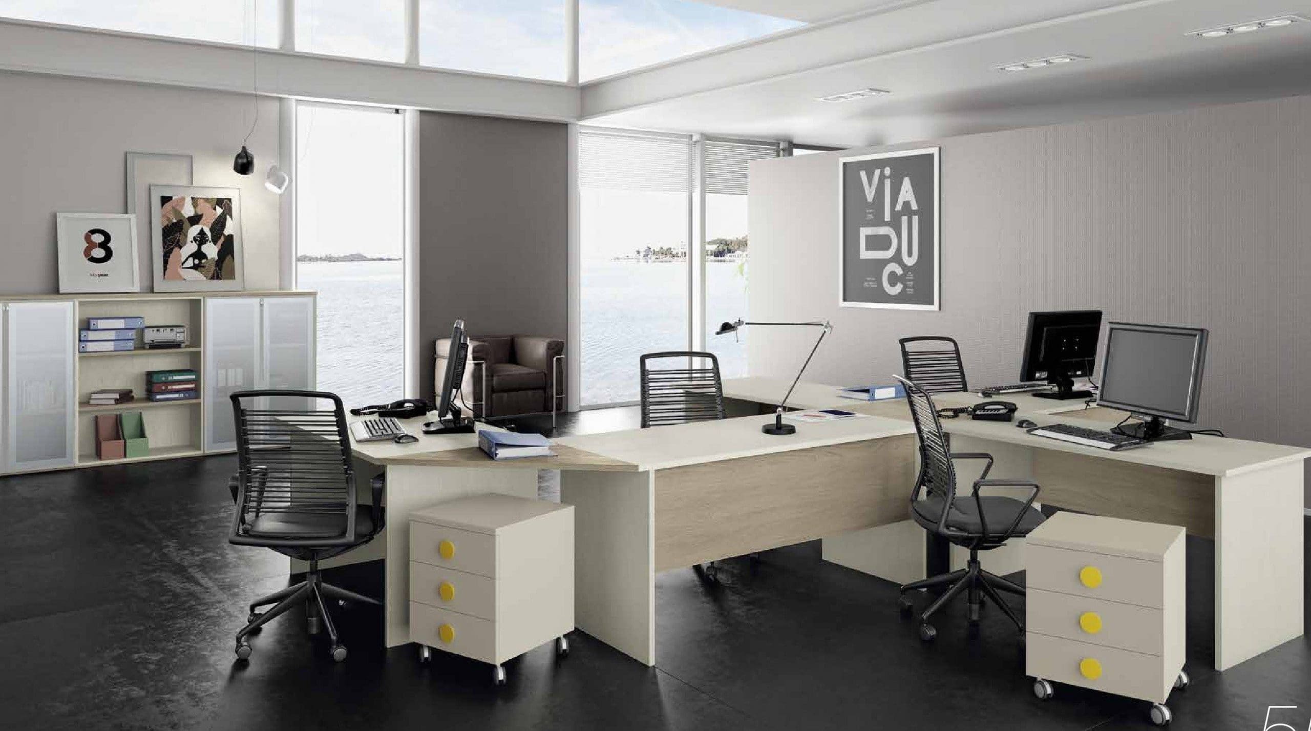 Para tus oficinas San Martino ha pensado en una composición que incluye cinco escritorios, una librería y dos cajones móviles para tener todo lo necesario en una sola compra. Además de los escritorios, hay mucho espacio para guardar todos tus documentos de trabajo y efectos personales. La estructura está formada por cinco escritorios unidos entre sí mediante elementos de unión en esquina. Por ello toda la composición, a excepción de la librería, está pensada para alojarse en un mismo ambiente para crear un espacio de trabajo sobrio, gracias a los colores suaves de la arena y la madera, con algunos toques de vida aportados por los tiradores de color amarillo canario. La línea sencilla y minimalista, combinada con los colores claros de la madera, harán que tu ambiente de trabajo sea juvenil y profesional al mismo tiempo.