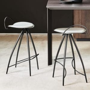 El taburete de piel Alessio, también disponible en la versión silla llamada Alessia, es fruto de la creatividad y la investigación estilística de Cattelan Italia. Combina una personalidad inconfundible con la comodidad que distingue a un taburete de diseño de excelente calidad. La sencillez de sus líneas es también su fuerza: cada detalle está hecho con cuidado y precisión. Este moderno taburete de cocina es la expresión de la excelencia de la fabricación italiana. Taburete con estructura de acero cromado (08) o cromado negro (06), pintado de negro (OP17) o grafito (OP69) o titanio repujado (GFM11). Respaldo y asiento de cuero según muestrario.