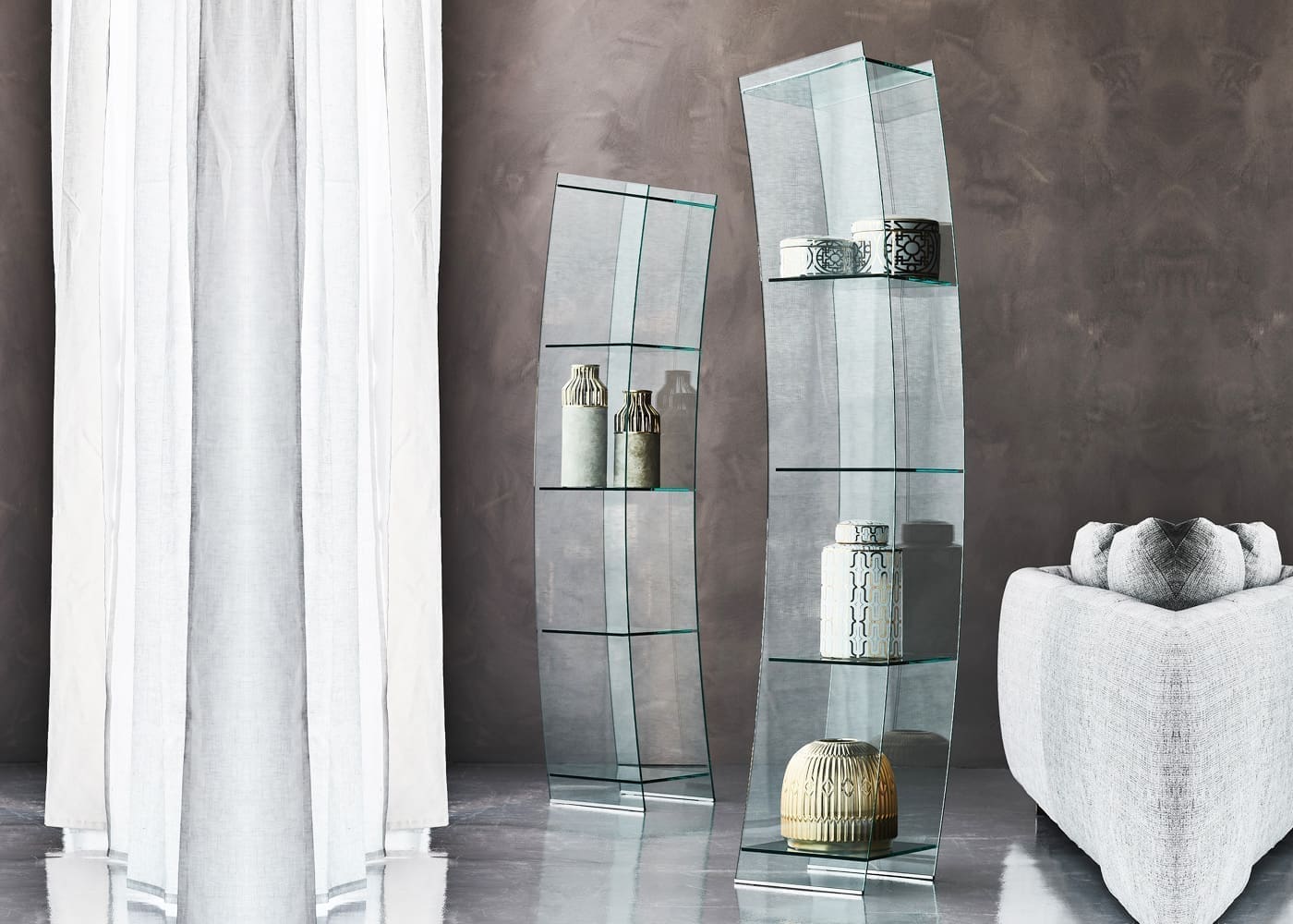 El armario de diseño Viento Abierto es un mueble refinado que aprovecha y realza la luminosidad de un salón moderno. Su forma curvada recuerda a una vela estirada por el viento. Gracias a esta trayectoria inusual, destaca en un salón de diseño refinado, dándole originalidad al tiempo que mantiene una elegancia sencilla.Esta moderna vitrina de salón con estantes abiertos está fabricada íntegramente en cristal, una característica que te permite exponer y resaltar tus objetos más preciados. Vitrina abierta de cristal transparente y detalles de acero inoxidable pulido. Capacidad máxima de los estantes: 7 kg cada uno