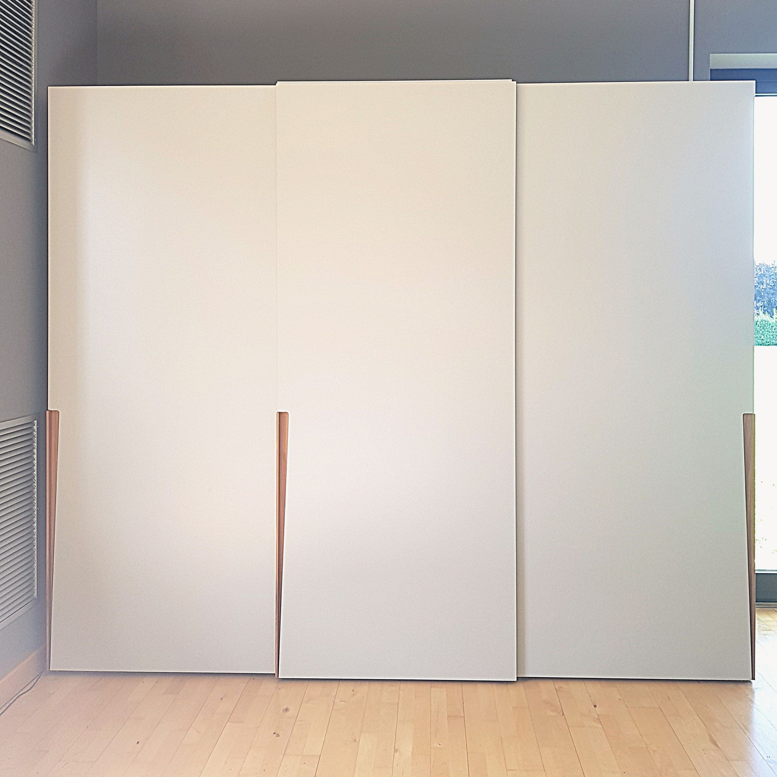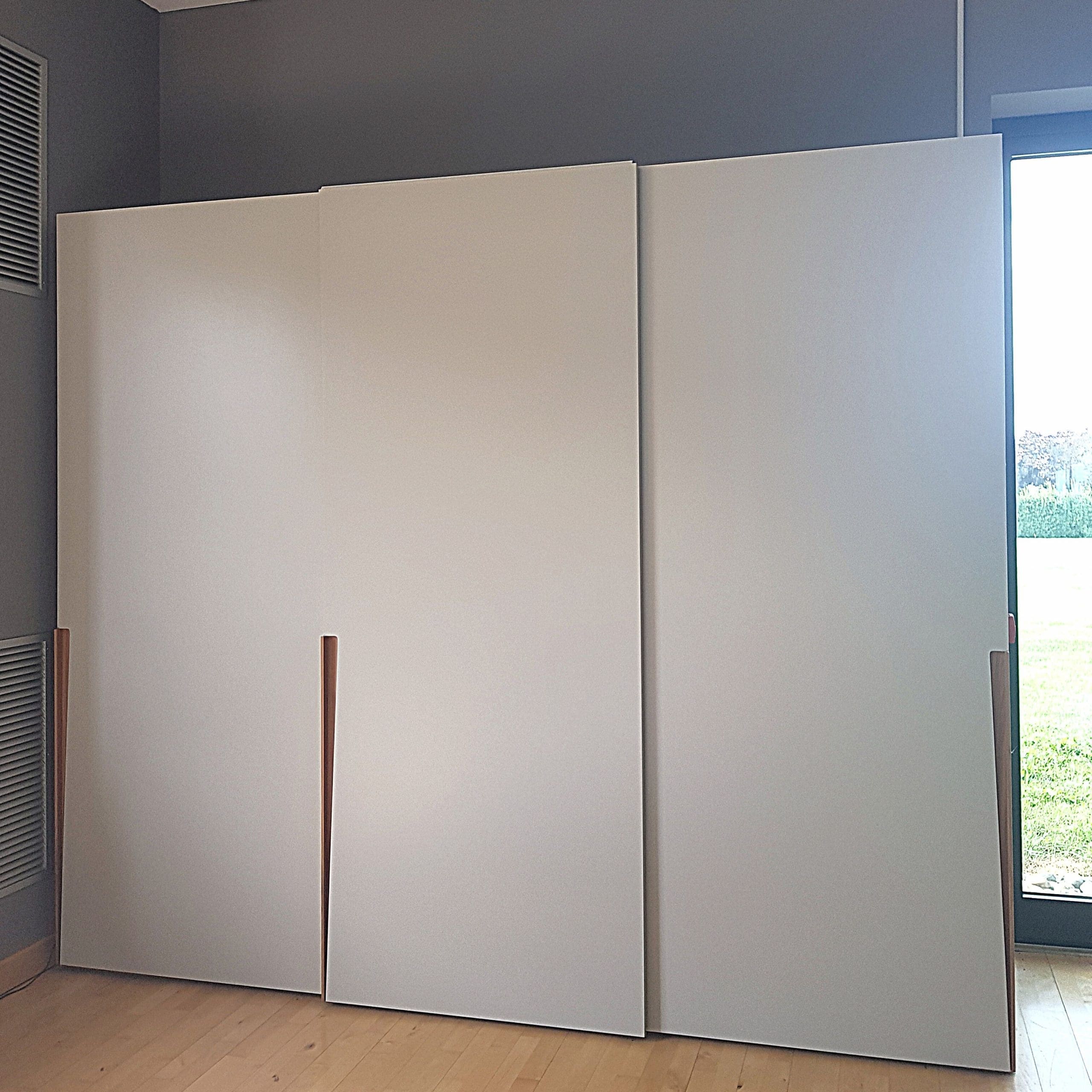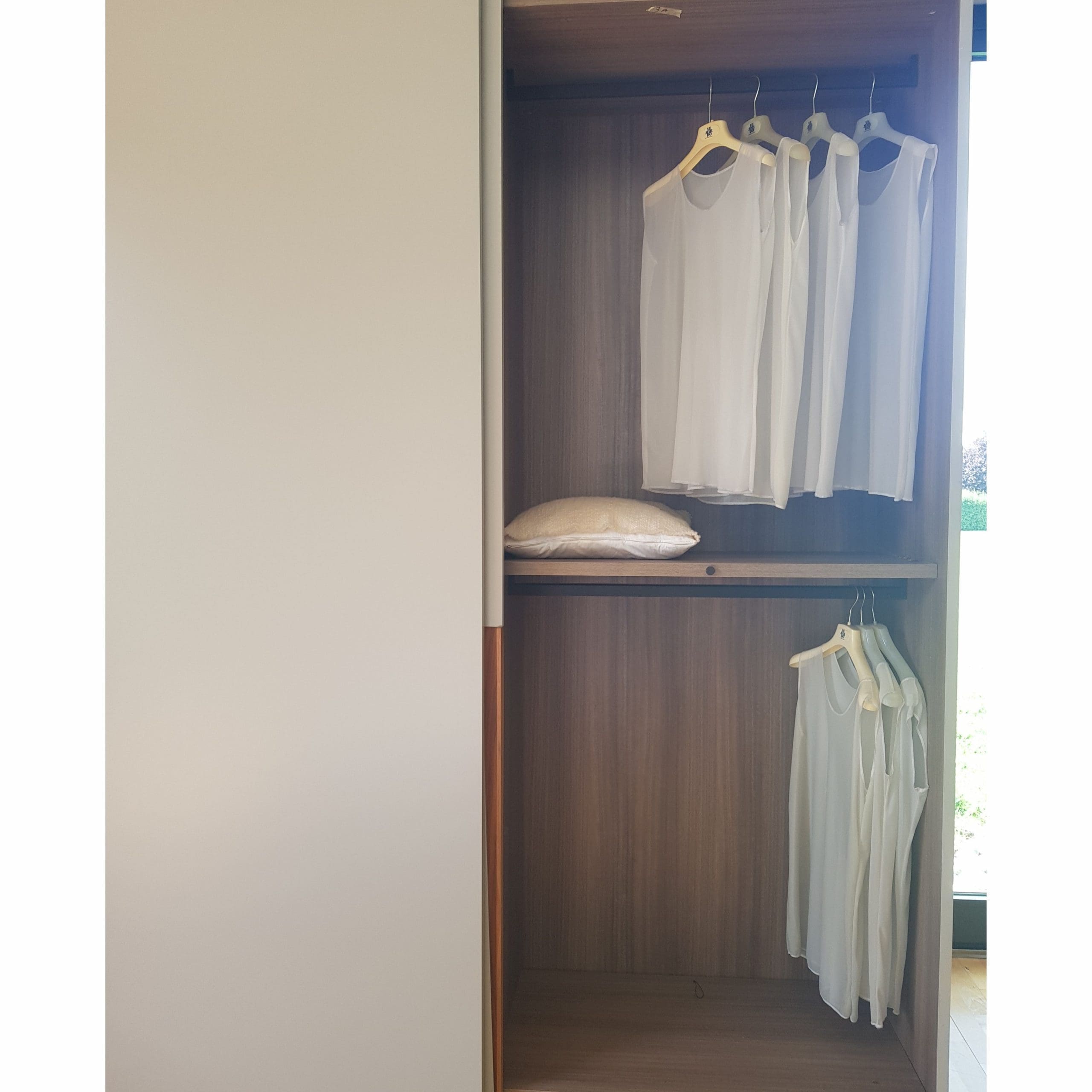 La oferta se refiere al armario corredero en lacado gris empolvado y con tiradores en nogal Canaletto. La estructura interna y la parte posterior están hechas de melamina de eucalipto.