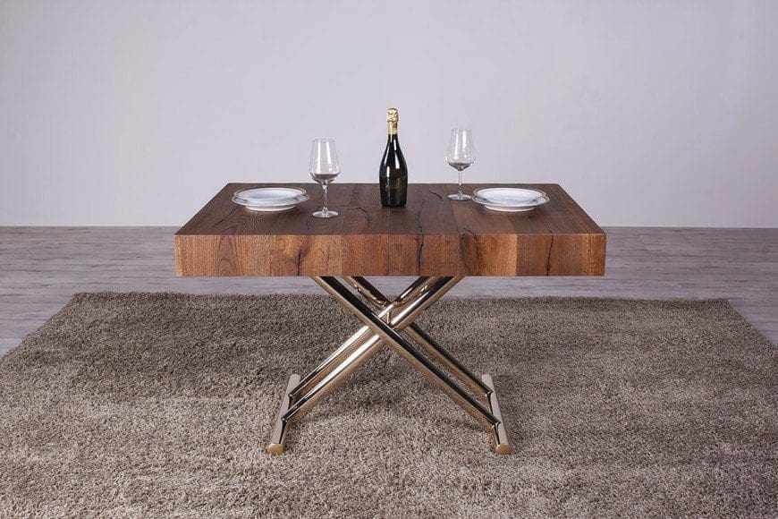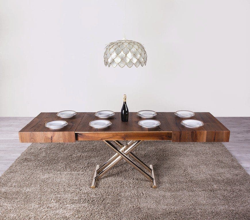 Mesa de centro convertible en mesa de comedor, regulable en altura con mecanismo de gas de 28 a 88 cm. La tapa rectangular es de madera ennoblecida con base pintada, con 2 extensiones internas. Bajo pedido, la mesa de centro está disponible en otros acabados con un precio adicional.