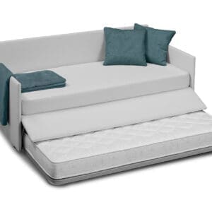 El modelo en promoción es en tela Antigua de categoría A completamente desmontable; Bajo pedido, está disponible en otros acabados y tamaños, incluida la versión maxi de 3 plazas con colchón de 160 x 190 cm. La península también sirve como contenedor. Brian tiene una apariencia simple y directa, lo que lo hace adecuado tanto para entornos tradicionales como modernos. Brian también está disponible con una cama completa (sábana inferior y superior y 2 fundas de almohada) y dos almohadas (con un suplemento ).