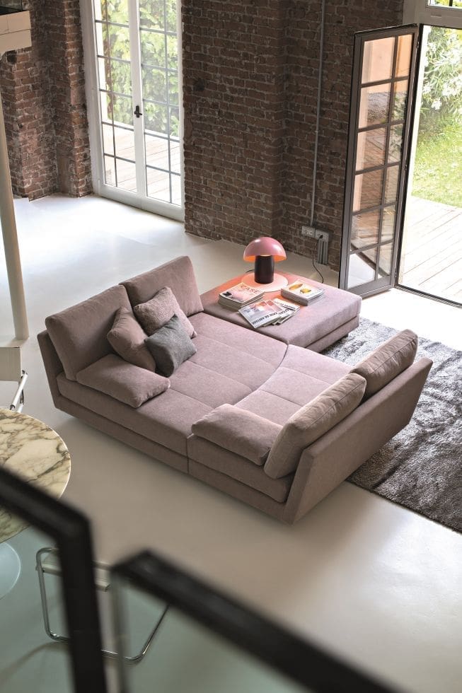 Está equipado con un madera maciza de abeto portante de varios espesores Está soportado por un bastidor base de acero pintado completamente recubierto de láminas de espuma de poliuretano y Tecnoform. Evans se compone en 3 formas posibles: abierto en la versión lineal, en un ángulo completado por su puf cuadrado y cerrado en la versión de cama.