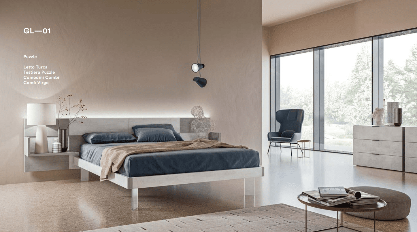 La composizione GL-01 a elementi sospesi ti offre una camera completa, composta da letto matrimoniale Turca_106, testiera Puzzle, comò Virgo, comodini Combi. Il letto Turca presenta le gambe in Plexiglass trasparente, testiera nella versione sospesa modello Puzzle formata da un pannello a muro e da pannelli applicati che donano dinamismo alla parete, realizzati nelle finiture color Calce Bianca, Calce Grigia. Le mensole sospese Combi fungono da comodini e sono realizzate nella finitura Calce Bianca. Il comò Virgo realizzato da pannelli melaminici nella finitura Calce bianca, cassetti con guide a scomparsa regolabili, maniglia in bronzo.