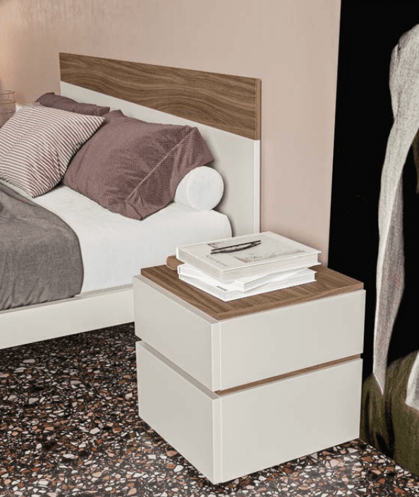 La composizione GL-08 ti offre una camera completa, composta da Letto Toledo, comodino e comò del gruppo System. Il letto matrimoniale Toledo è realizzato in nobilitato e propone una contrapposizione di colori freddi e caldi nella testiera, dove spicca la fascia superiore diagonale in nobilitato Noce, il resto della struttura è realizzata nella finitura color perla. Propone quindi un effetto bicolor con l’accostamento del Noce ed il Perla, un motivo che viene ripreso in tutti gli elementi. Il gruppo System composto da Comodino bicolore a 2 cassetti e comò a 3 cassetti in tre finiture: Noce, Perla e Beige; dispongono di scocche realizzate con pannelli in melamminico, piedini regolabili, cassetti con apertura push-pull.