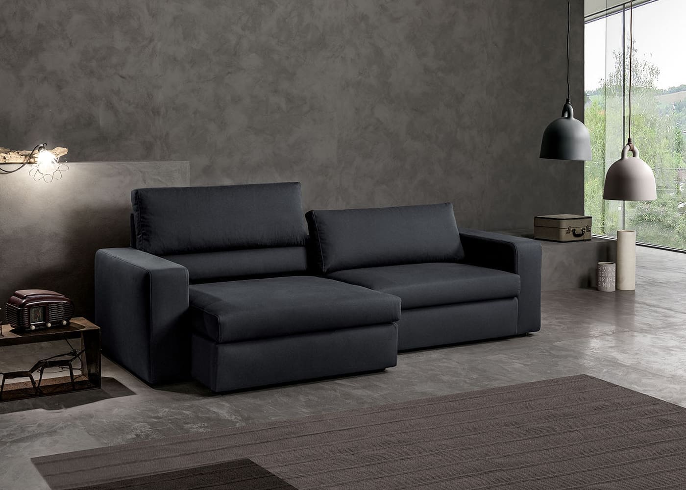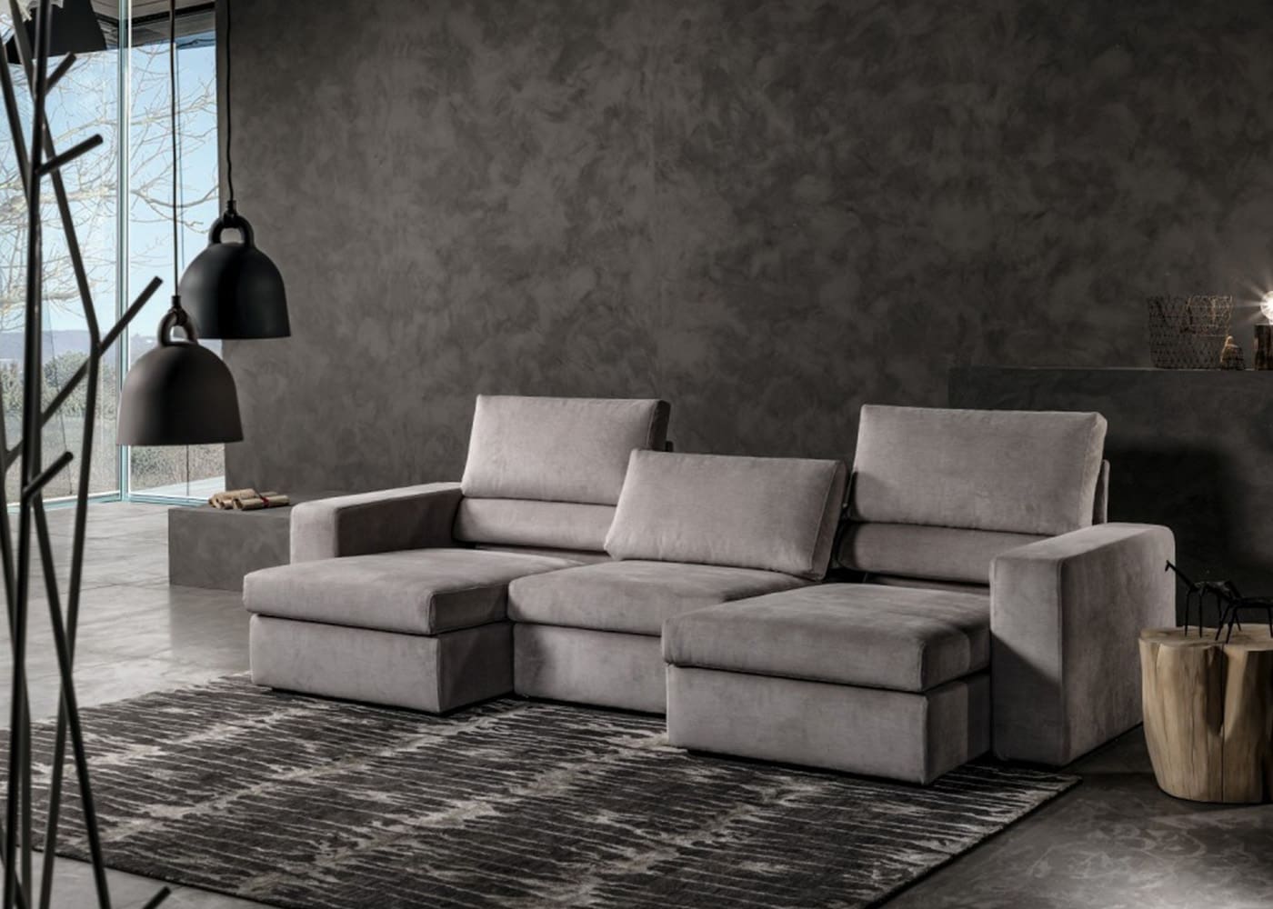 Divano con seduta e schienali regolabili in velluto grigio dal design ricercato e innovativo, completamente sfoderabile.