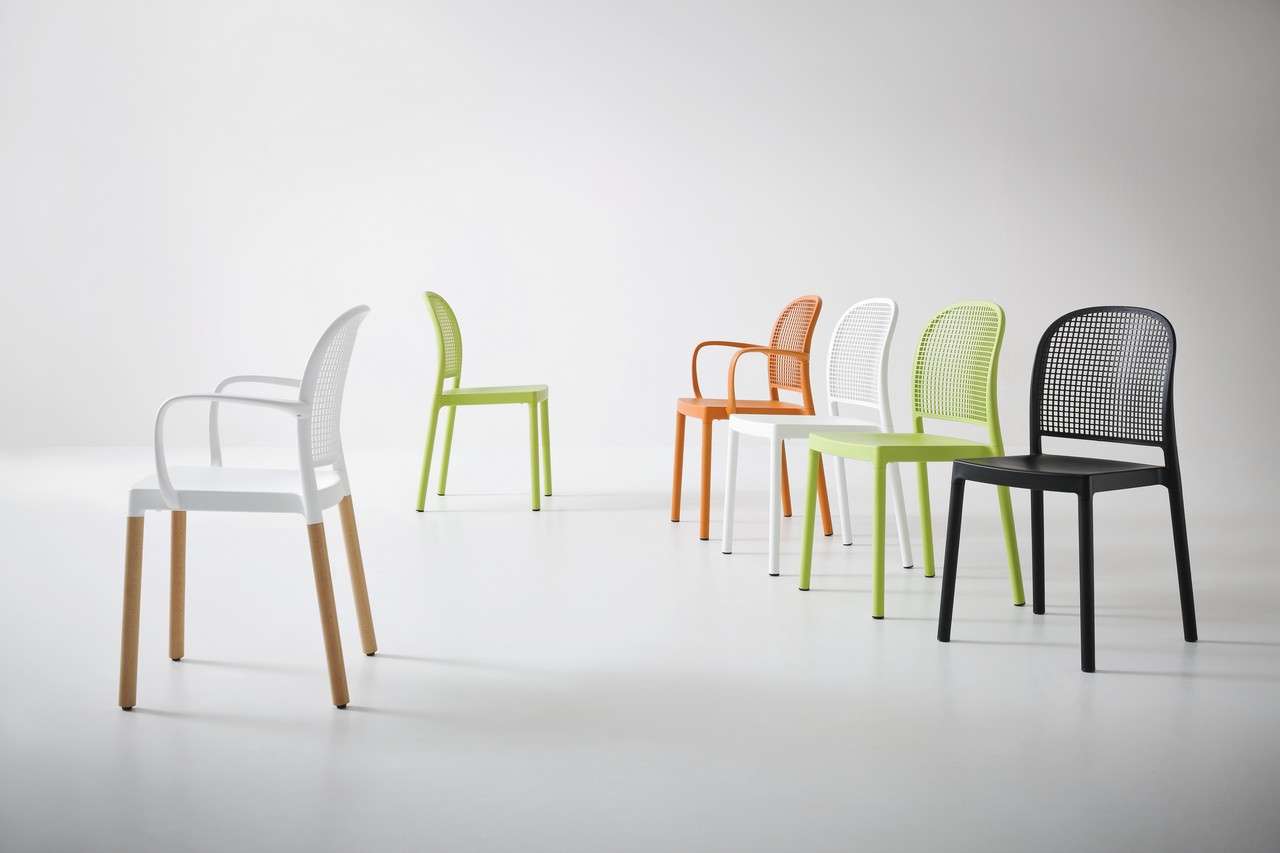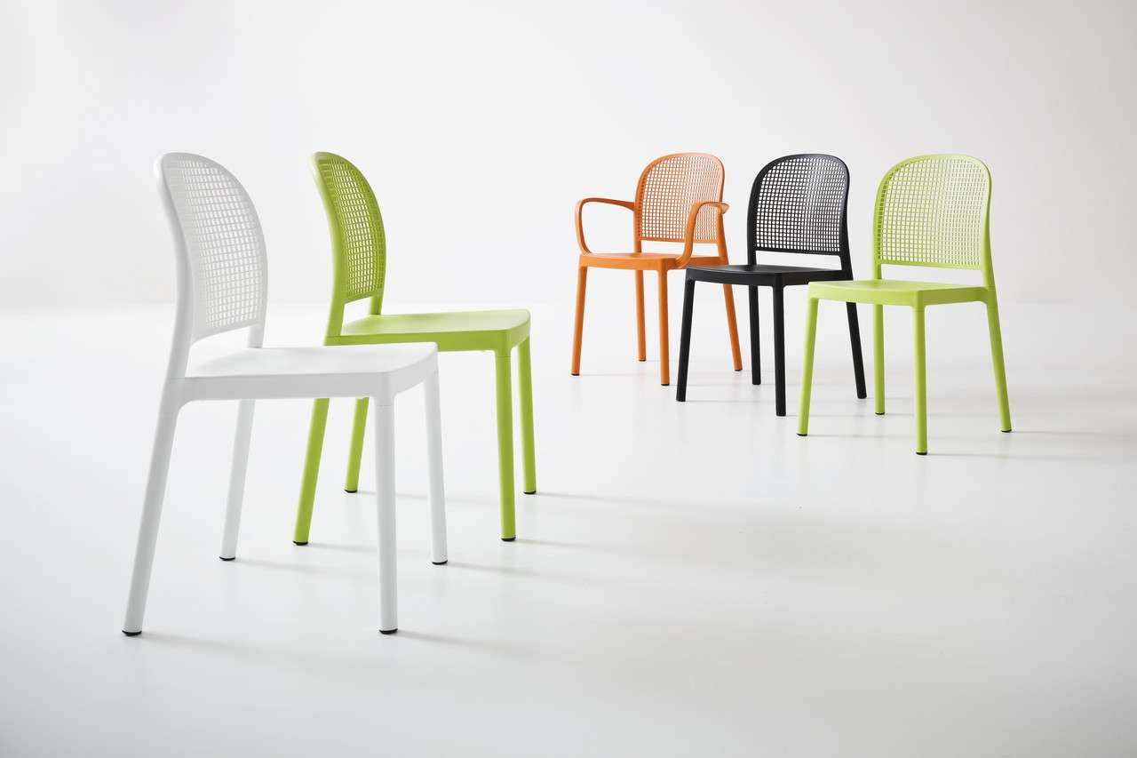 Adatta sia per spazi indoor che outdoor, è una seduta caratterizzata da linee morbide, resistente agli agenti atmosferici. Presenta una struttuta di 4 gambe in co-inezione metallo-polimero e scocca in tecnopolimero. Garantisce una comoda seduta, ed è una soluzione salvaspazio perchè facilmente impilabile. Disponibile nelle colorazioni del Bianco, Nero, Arancione, Marrone, Verde; su maggiorazione di prezzo è disponibile anche nelle versioni con braccioli, struttura in legno, seduta o schienale imbottiti.