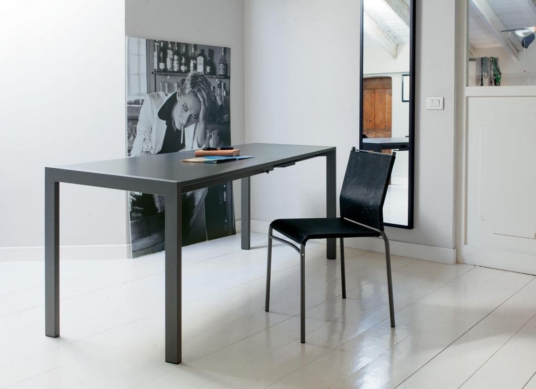 Ciack è un tavolo allungabile con una solida struttura in acciaio laccato ed un elegante piano in melaminico. E’ un tavolo perfetto per essere posizionato in spazi piccoli garantendo comunque un funzionale utilizzo dello spazio, infatti, grazie alla sua comoda allunga, Ciack arriva fino a 140 cm, permettendoti di invitare a cena quante persone vorrai.