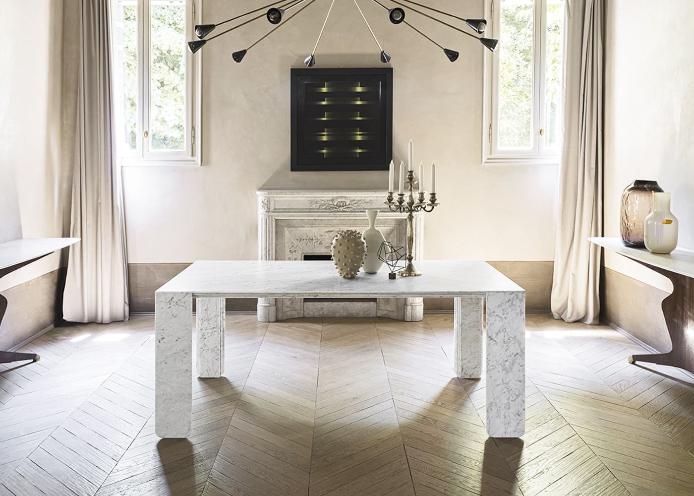 Elegante e scultoreo, il tavolo Corinto, interamente realizzato in marmo, racchiude in sè un fascino unico, frutto di rinnovati equilibri tra materia e geometria. Il ripiano e le gambe sono realizzati a partire dall’accostamento di lastre in marmo lavorate lungo gli spessori: sottili sbalzi di 9,5 mm, direzionati verso l’interno, conferiscono ai volumi slancio e dinamismo. Le gambe vengono raccordate a terra per esaltare l’effetto di leggerezza della materia e gli scalini verticali si innestano con quelli orizzontali del piano in un incastro perfetto e delicato. A garanzia della stabilità strutturale, un’anima in ferro, che ne permette anche un facile e corretto assemblaggio.